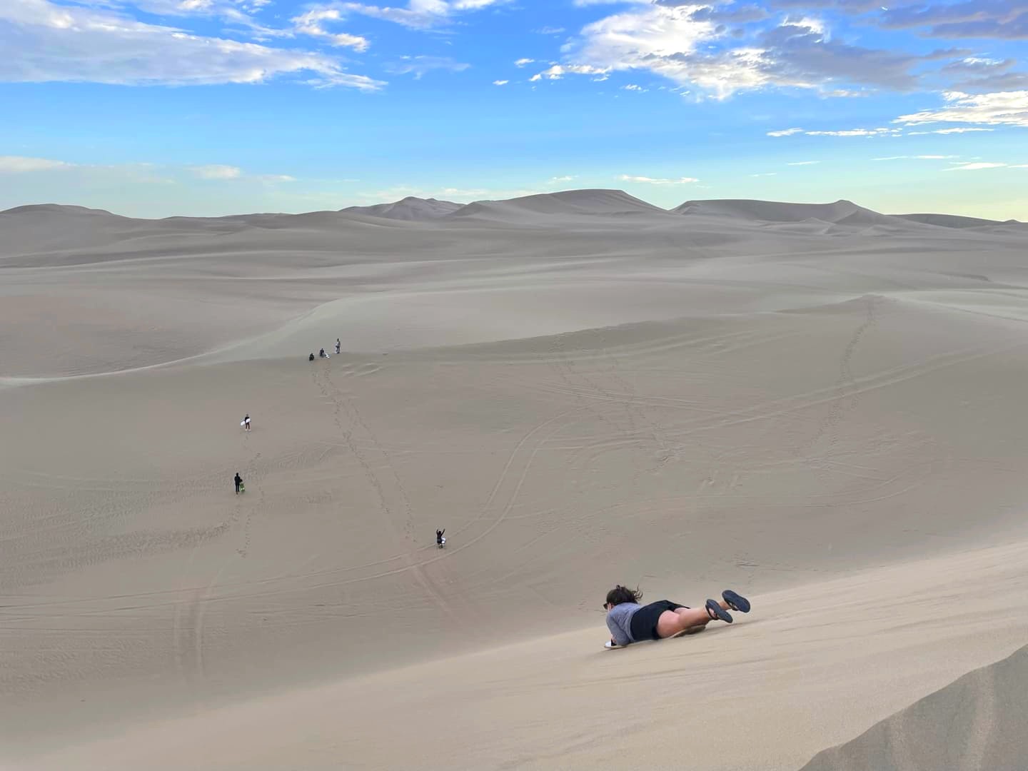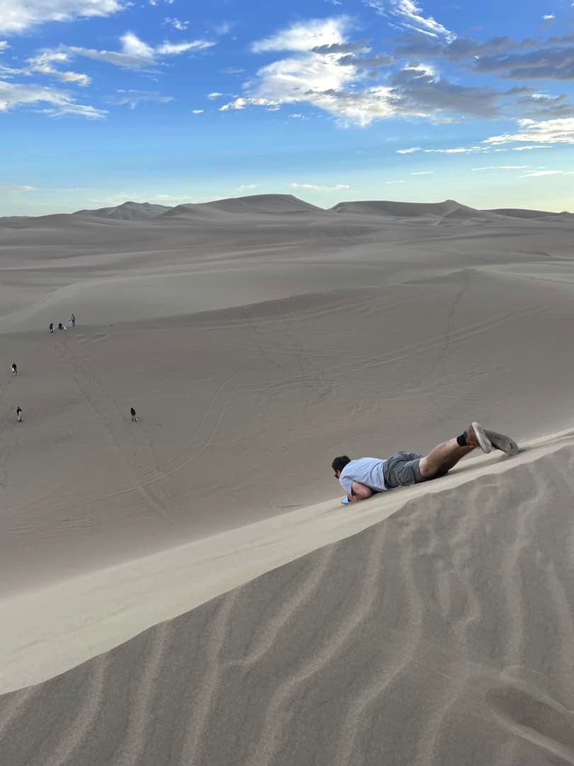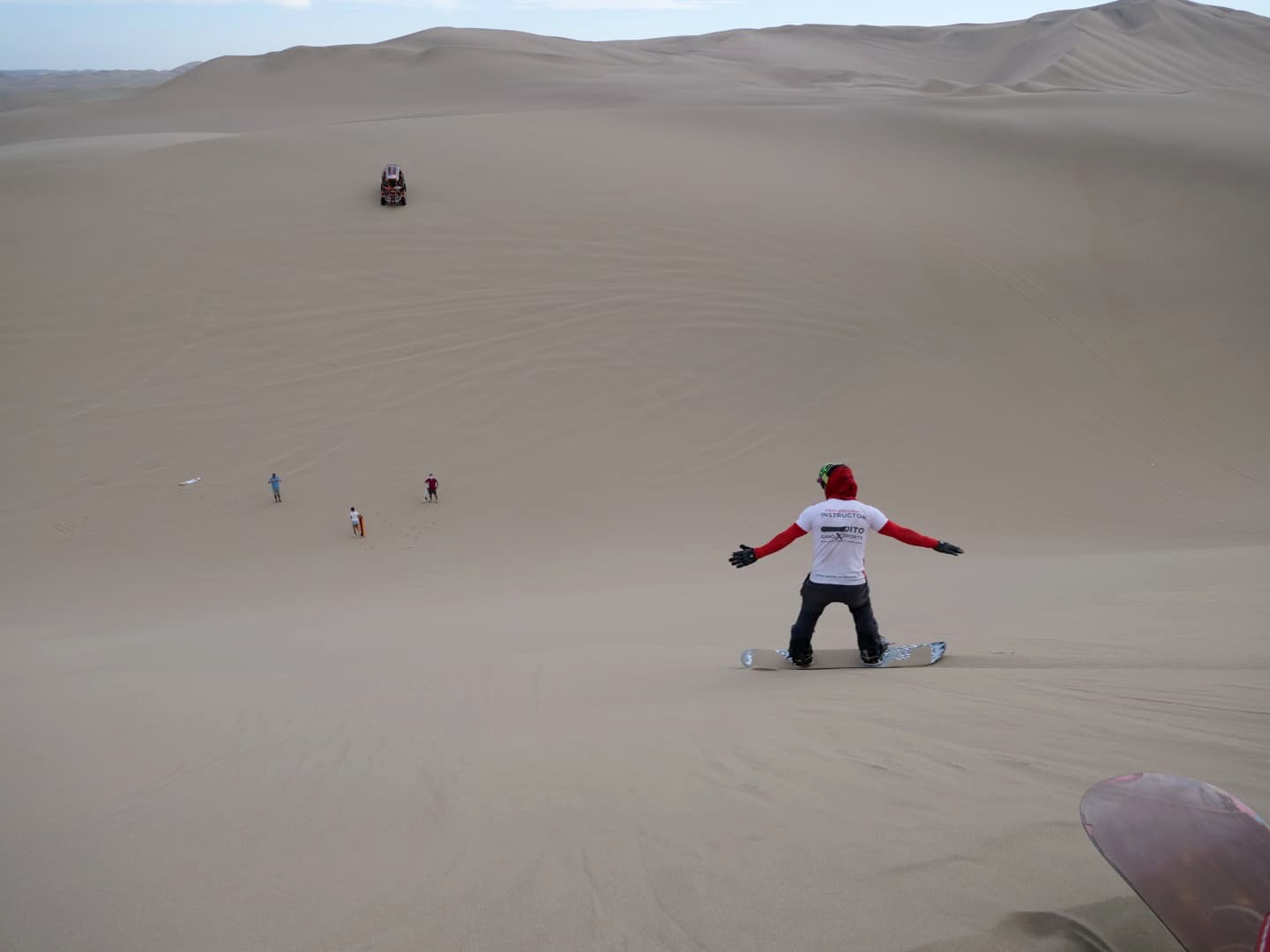 Ce qui est cool, c’est qu’on commence par un spot assez simple, et les descentes augmentent au fur et à mesure pour ceux qui veulent corser les choses. On l’a fait avec une simple planche de surf (sandboard), mais il est aussi possible (pour ceux qui gèrent un peu car ça a l’air bien plus compliqué !) de descendre avec une planche de snowboard.