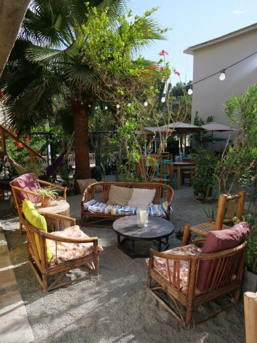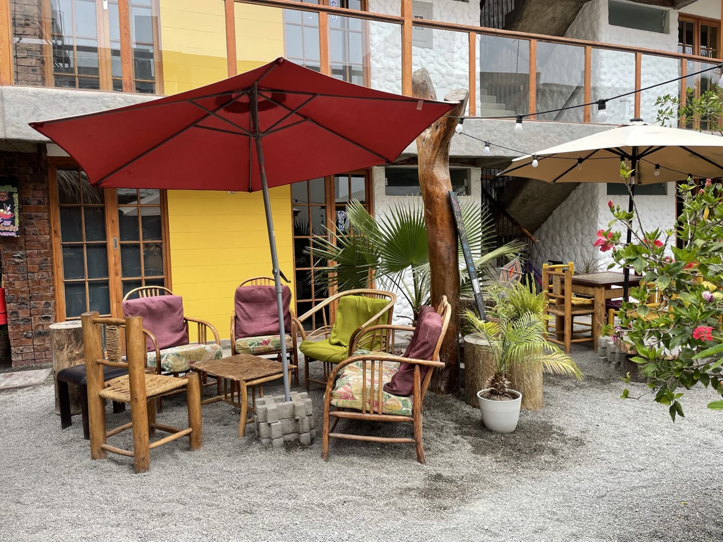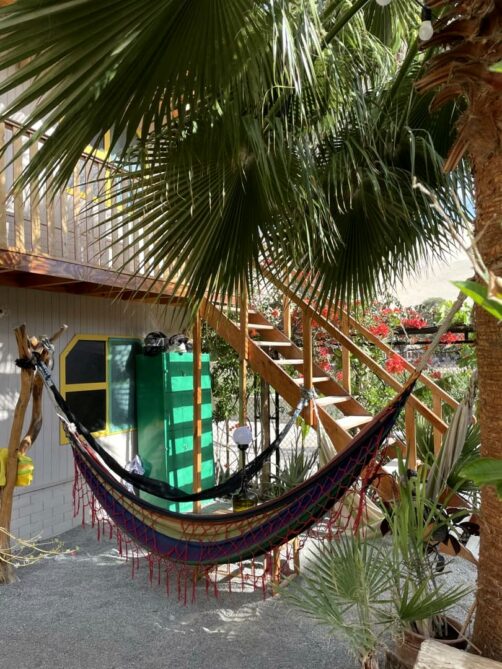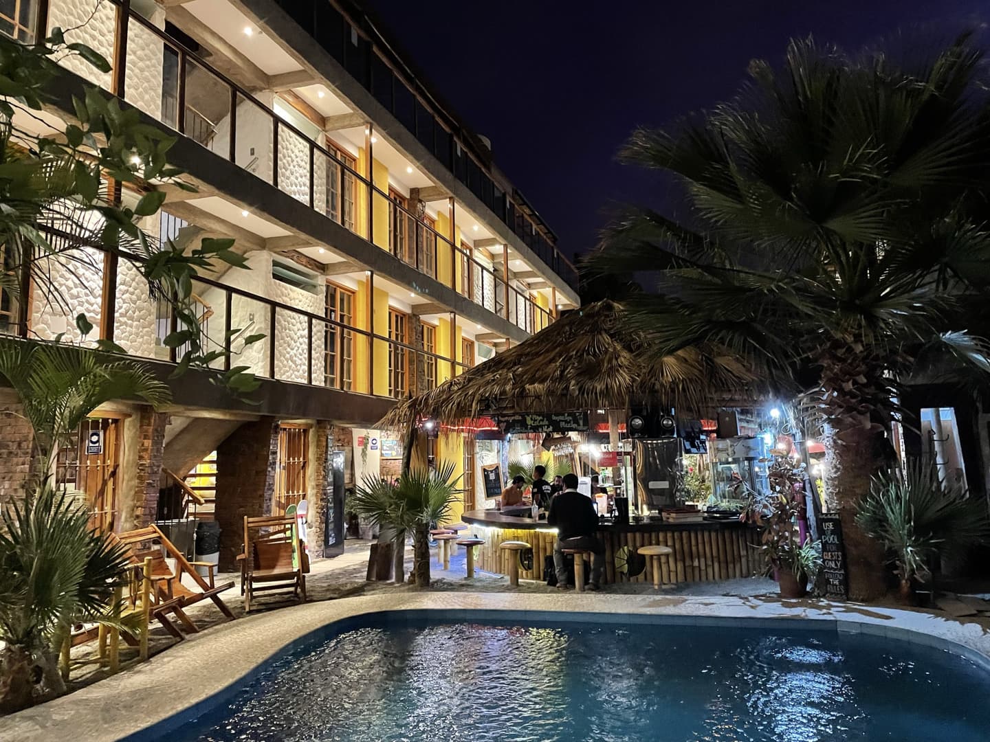 Après moultes hésitations (ce n’était pas forcément les hôtels les plus chers qui avaient l’air les mieux notés…), j’ai finalement opté pour le Banana’s Adventure et je pense que ce fut un bon choix ! L’ambiance était super sympa, avec un agréable espace commun extérieur (petite piscine et de nombreux endroits pour se poser les pieds dans le sable). Notre chambre privée avait vue sur la piscine et sur les dunes tout autour (mais ils ont aussi des dortoirs, pour les petits budgets).