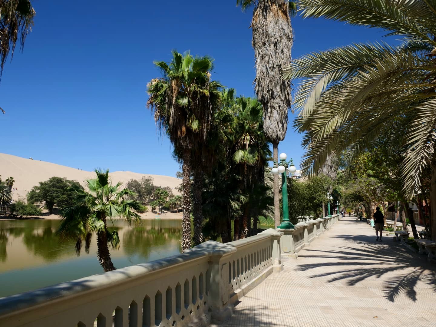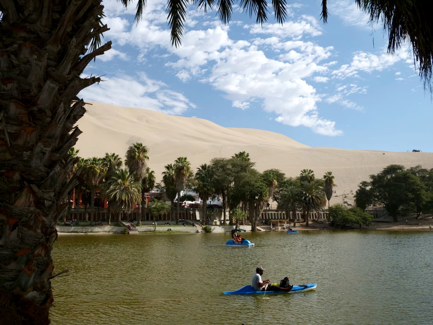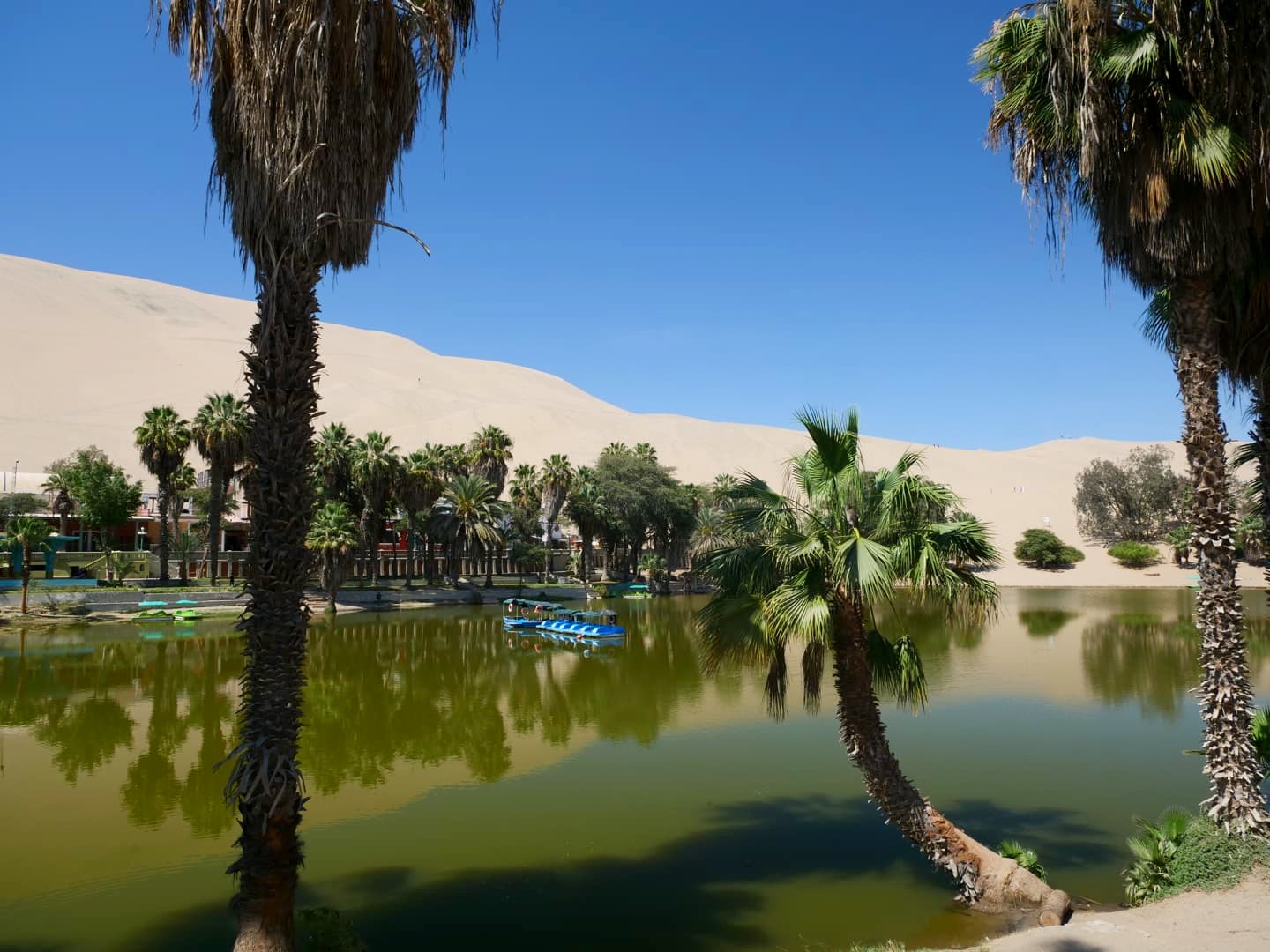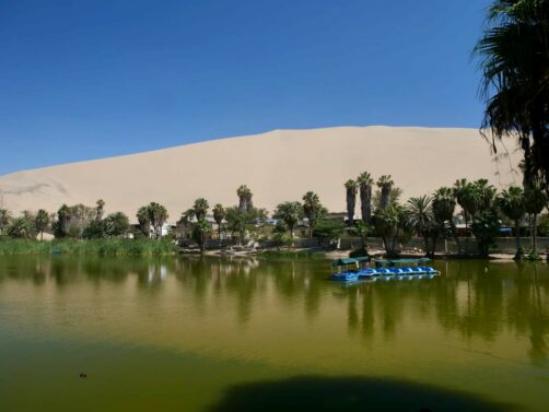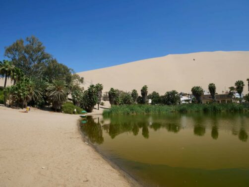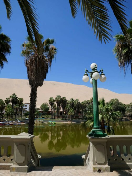 L’oasis de Huacachina n’est pas bien grande et tous les hébergements, bars et restaurants se trouvent les uns à la suite des autres tout autour de la petite lagune qui se trouve au coeur de l’oasis. Bref, le tour de l’oasis est vite fait ! Mais ça reste sympa de s’y balader et de profiter d’un peu d’ombre apportée par les palmiers.