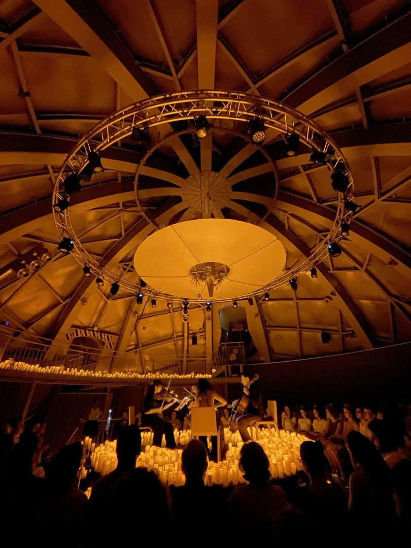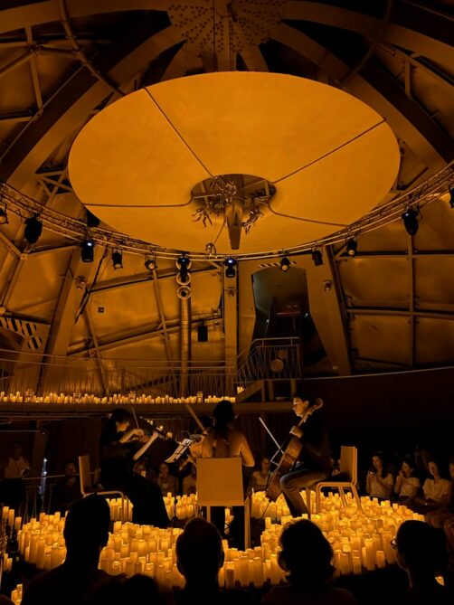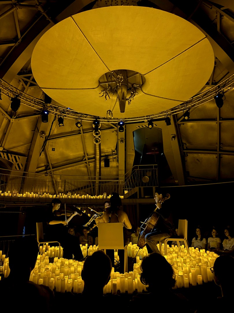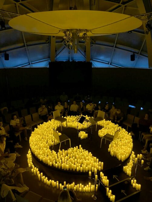 En effet, cet été, fever a proposé une série de concerts Candlelight dans l’un des grands symboles de Bruxelles. Les concerts éclairés à la bougie, en petit comité, étaient organisés dans l’une des boules de l’Atomium, dans la salle Prigogine. Ce cadre retro-futuriste se mariait parfaitement avec l’ambiance créée par les bougies, même si – spoiler alert : ce ne sont en réalité pas de vraies bougies (ce ne sont pas de vraies flammes, pour des raisons compréhensibles). Malgré tout, l’effet est là et ça crée un cadre plutôt romantique (il n’y avait d’ailleurs quasiment que des couples !).