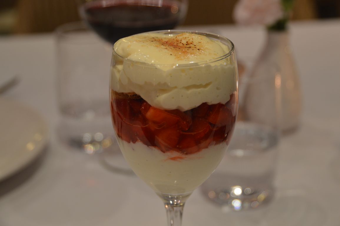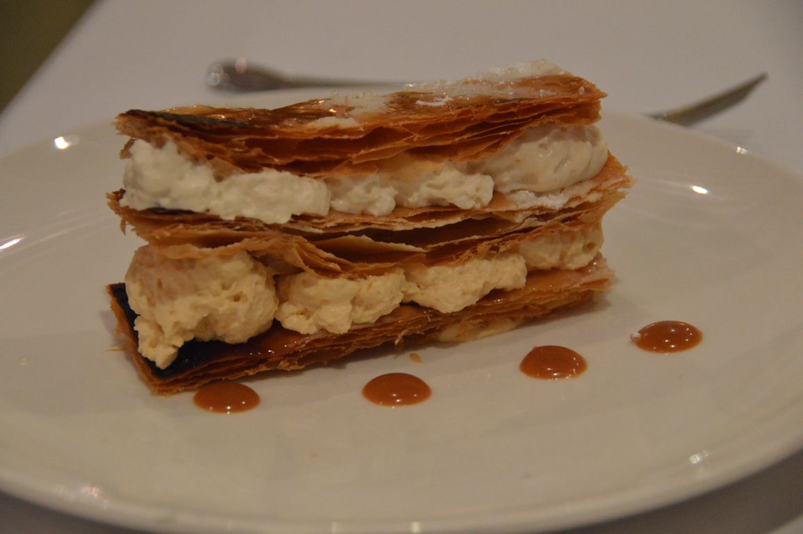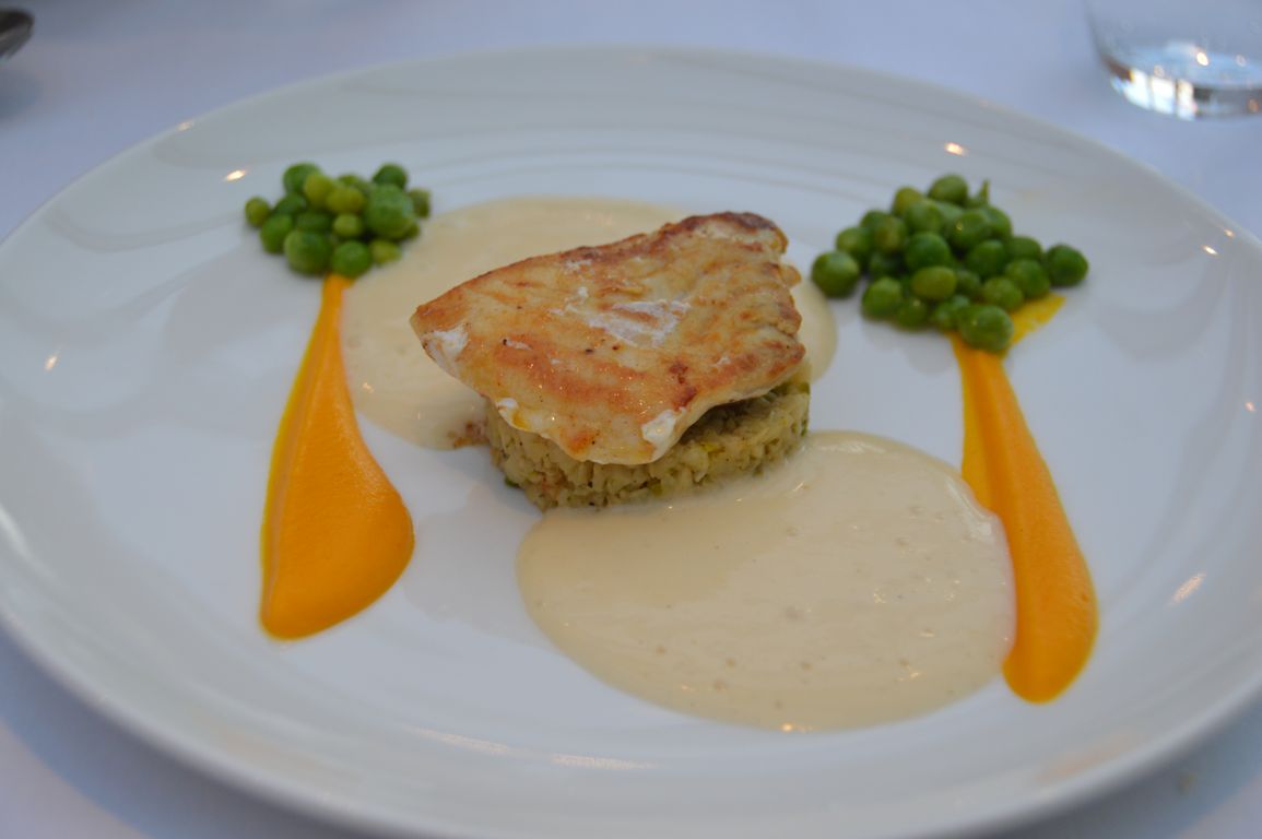 Nous avons ensuite opté pour le « Menu Plaisir » à 55€, un menu 6 services à l’excellent rapport qualité-prix ! Ont donc défilé devant nous deux entrées (Les Langoustinas, jambon, melon et carpaccio de tomates – et Le tartare de veau, câpre, sauce tonnato et tuile de pain ), deux plats (Le turbot meunière, crémeux carotte, céleri rave, beurre acidulé – et Le pigeonneau d’Anjou, risotto aux petits pois frais, artichaut et aubergine), un plateau de fromages (fromages moitié belges moitié français) et un dessert (Le mille-feuilles croustillant, caramel au beurre salé et bananes – et pour moi qui ne supporte pas la banane: Les fraises du pays, riz au lait, sablé et citron vert). Il va de soi que nous étions totalement repus après ce festin !