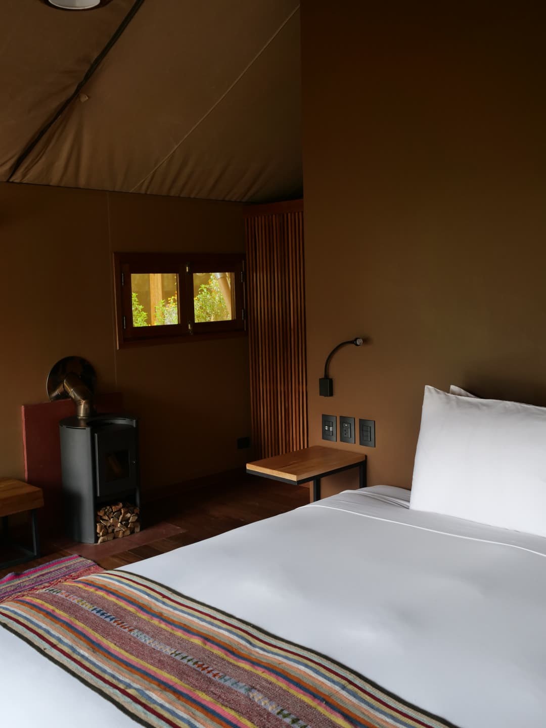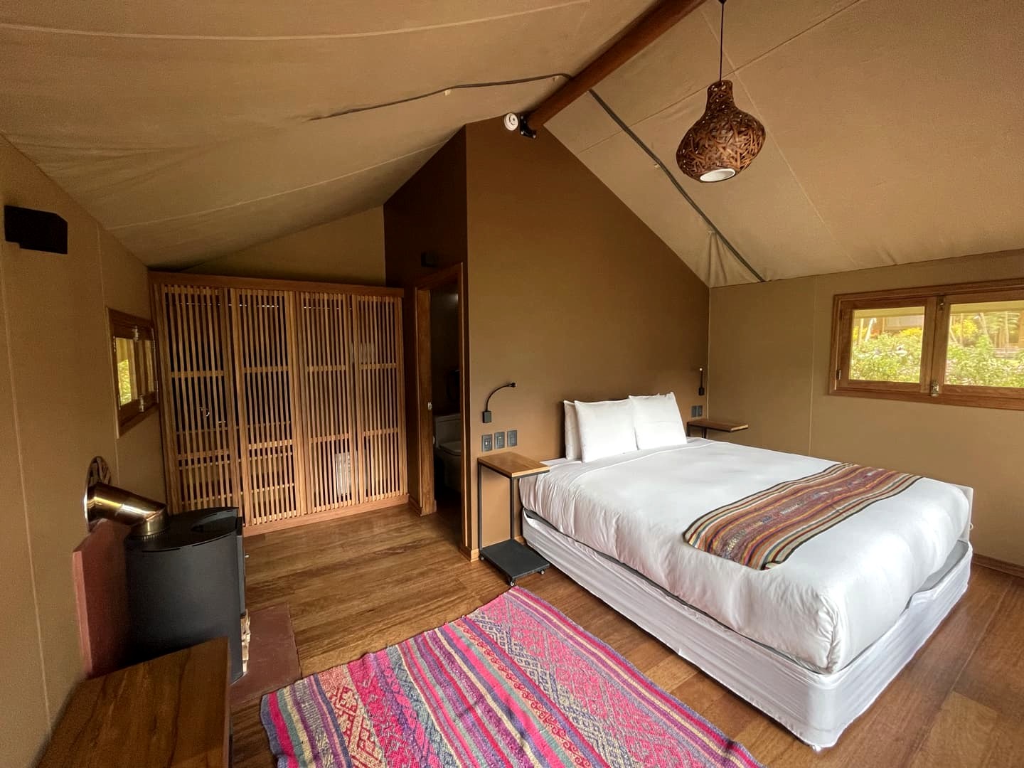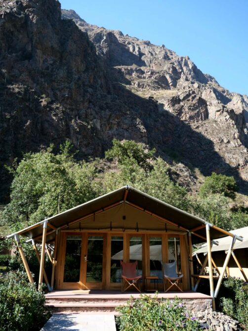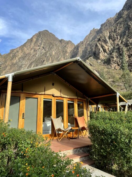 On est sur du glamping de luxe ici, avec des tentes tout confort, un grand lit ultra confortable, un chauffage électrique doublé d’un chauffage au bois (qu’ils viennent allumer pour vous tous les jours vers 17h si vous le souhaitez !), une grande salle de bain avec douche, une terrasse avec vue grandiose sur les montagnes… C’est vraiment très calme : on n’y entend que les bruits de la nature (avec des colibris partout en prime !). Bref, c’est l’endroit parfait pour se relaxer et se déconnecter (vu qu’en plus le réseau n’est pas top – mais comme souvent au Pérou).