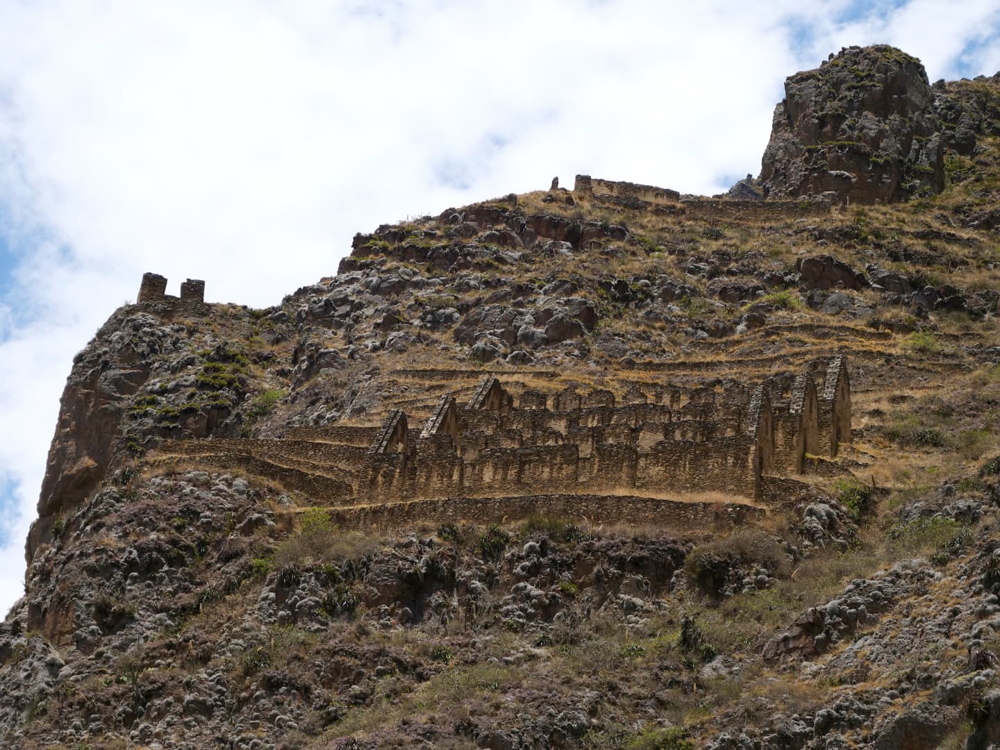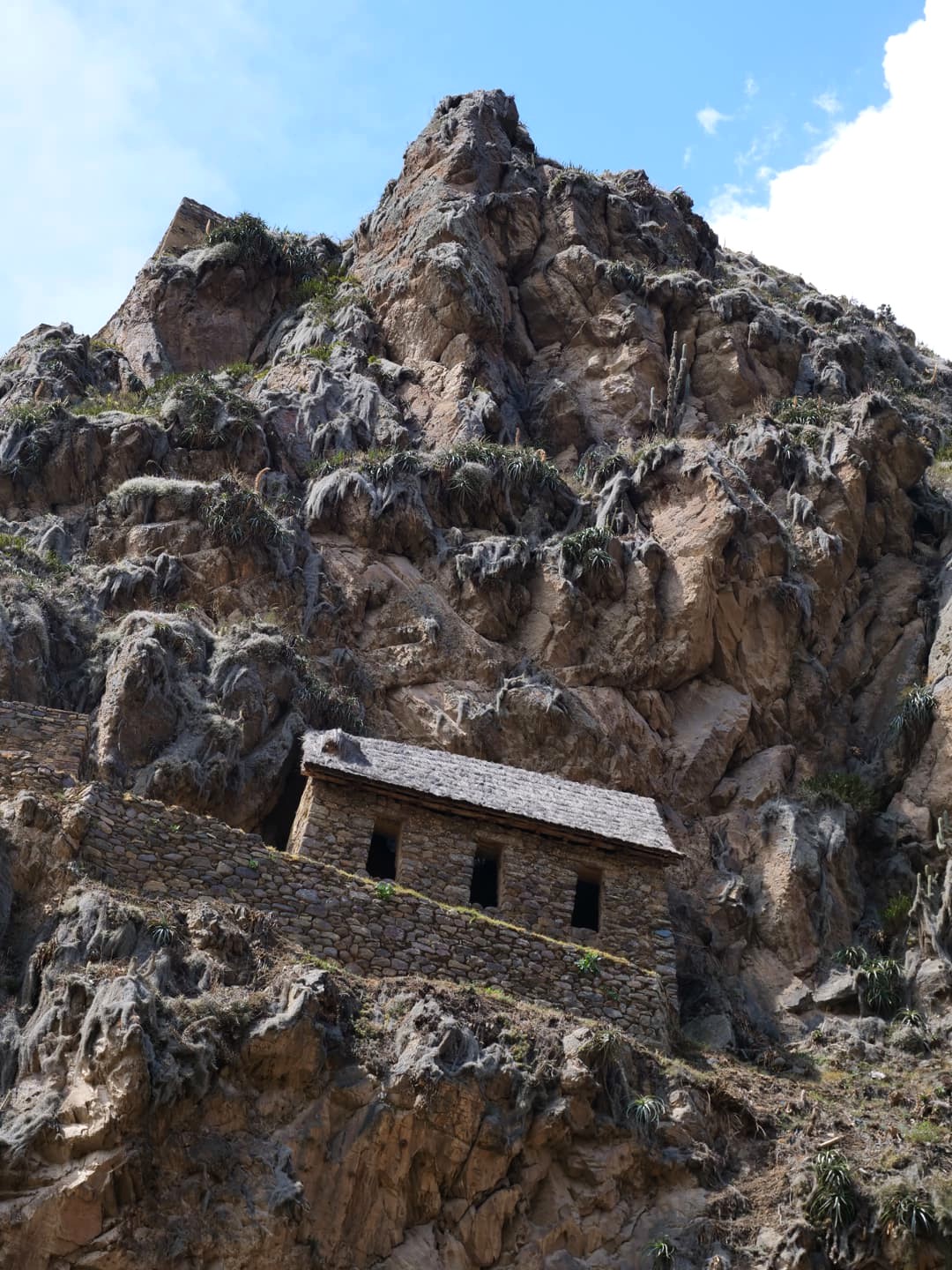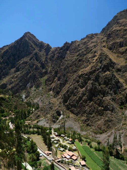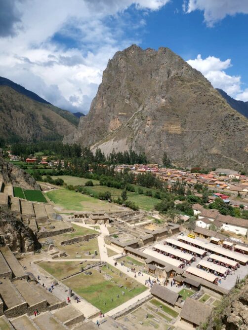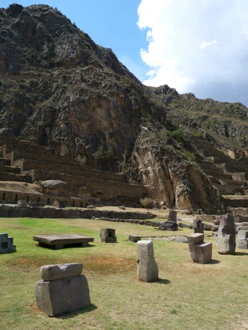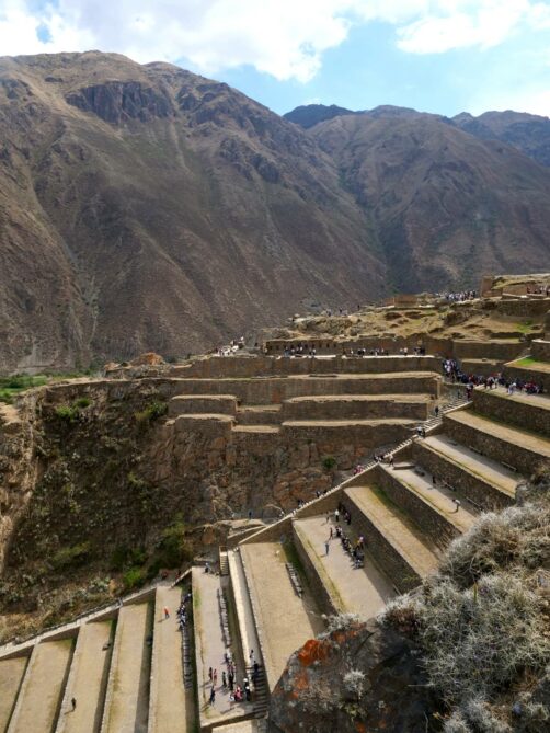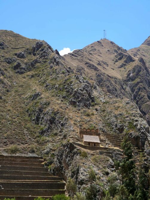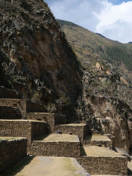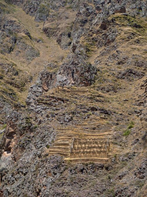 Depuis la forteresse d’Ollantaytambo, l’oeil est attiré par une autre structure qui semble pendue au milieu des montagnes d’en face. Il s’agit en réalité d’anciens greniers à pommes de terre, eux aussi incas ! Un sentier permet même de monter jusque-là, pour les plus courageux…