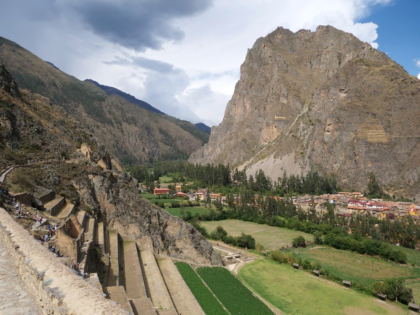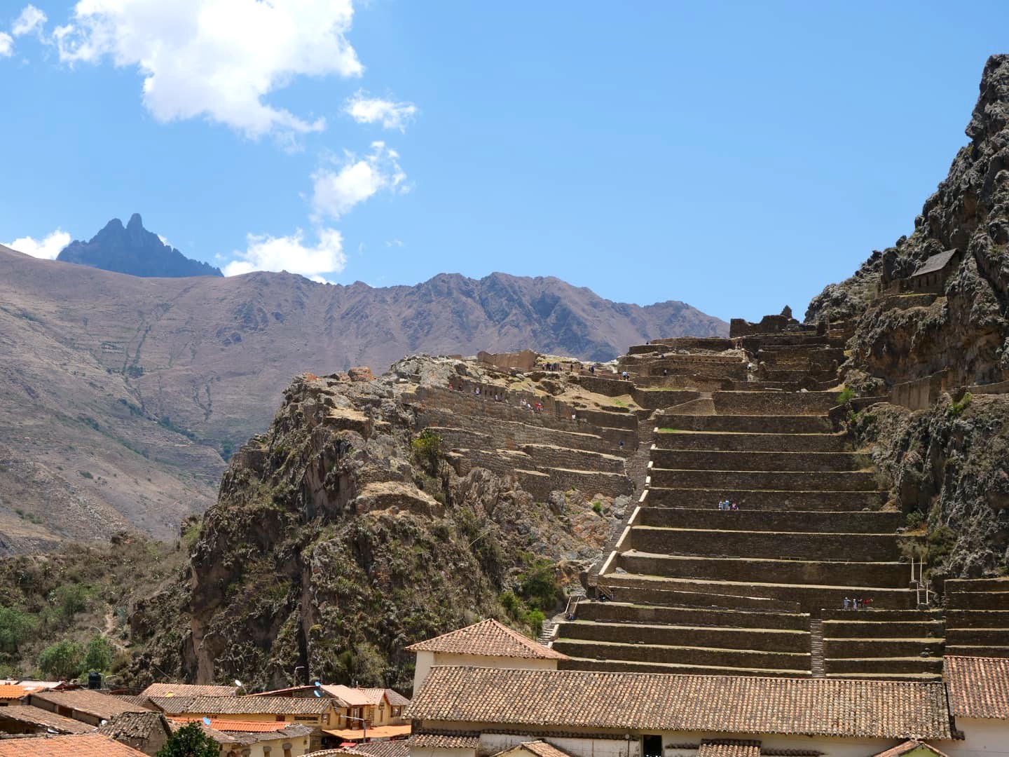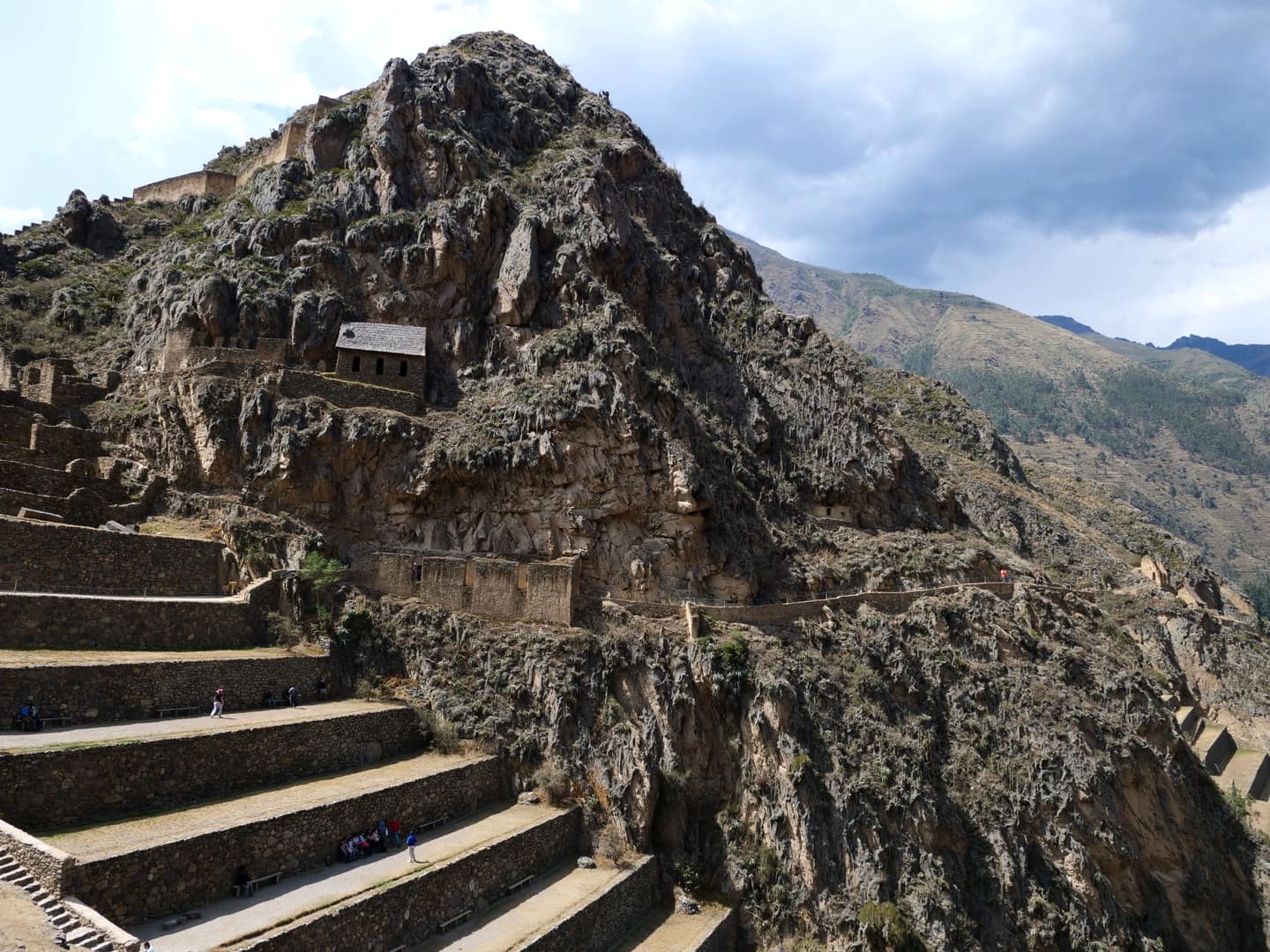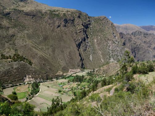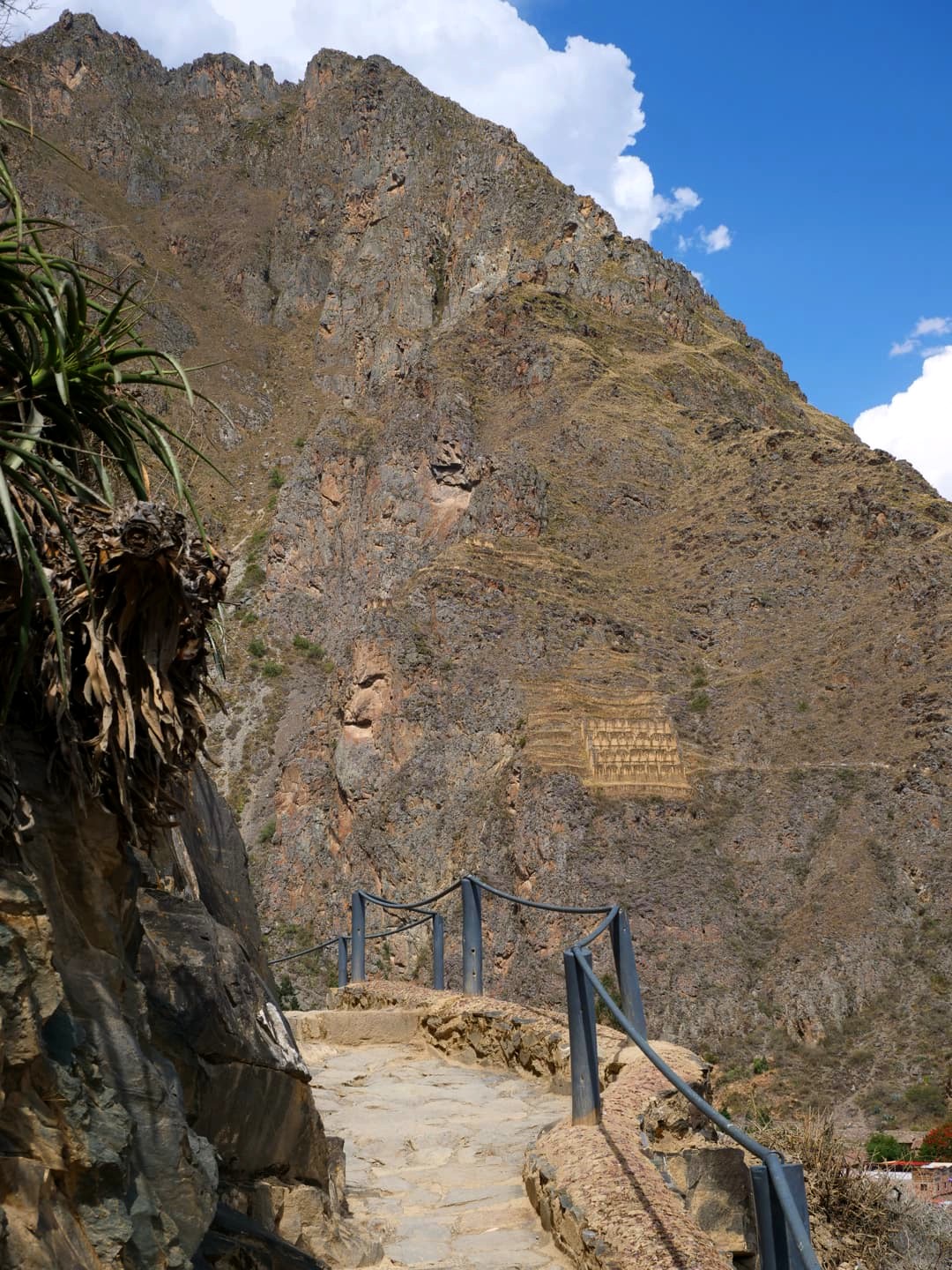 Depuis la forteresse d’Ollantaytambo, l’oeil est attiré par une autre structure qui semble pendue au milieu des montagnes d’en face. Il s’agit en réalité d’anciens greniers à pommes de terre, eux aussi incas ! Un sentier permet même de monter jusque-là, pour les plus courageux…