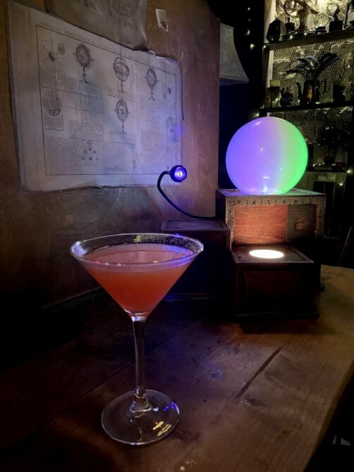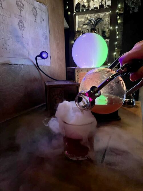 L’expérience complète (qui peut être adaptée en version avec ou sans alcool) dure deux heures et inclut trois cocktails par personne… dont deux que vous allez devoir préparer vous-mêmes en suivant la « potion » ! Les serveurs jouent à fond le jeu, tout comme les autres participants. On a vraiment trouvé l’ambiance très sympa. Et si vous voulez un petit spectacle supplémentaire, demandez (en supplément) un « Dragon Breath », ça vaut le coup d’oeil…