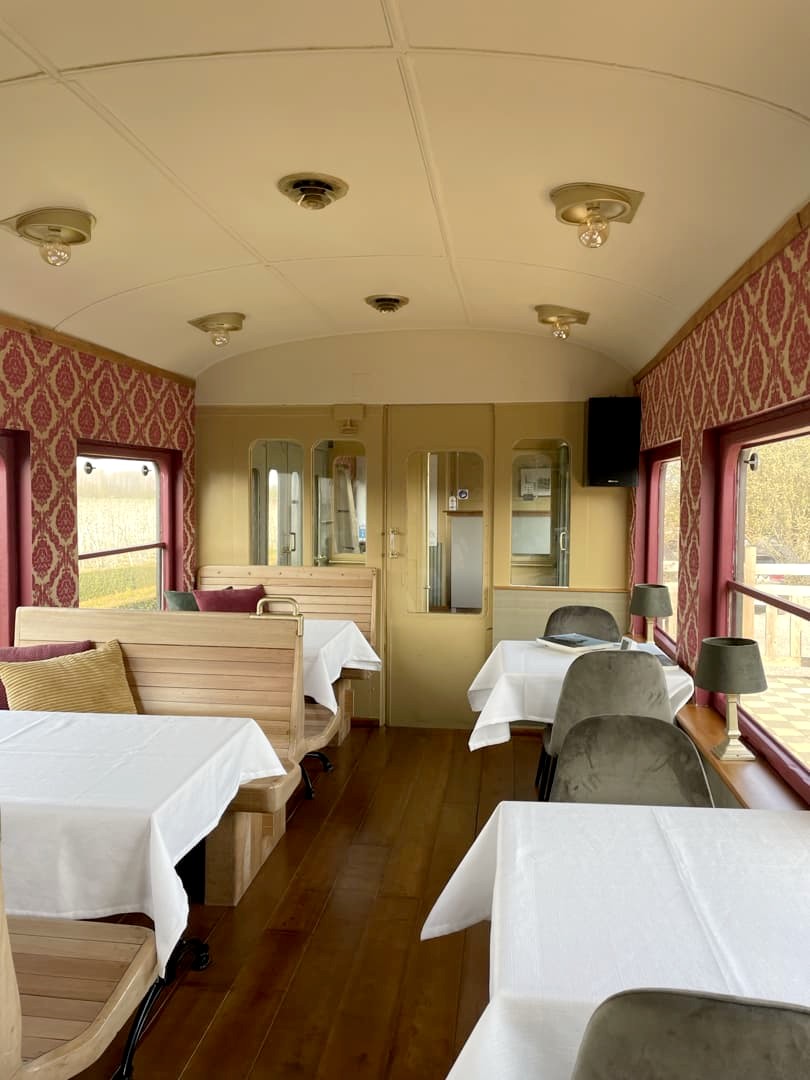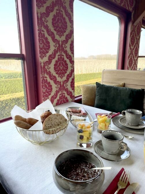 Les chambres, très confortables (avec même la climatisation !) se situent dans le bâtiment de l’ancienne gare. Mais le petit-déjeuner, lui, se prend dans un wagon de train vintage ! C’est surtout pour ça que j’avais choisi cet hôtel, et je dois dire que je n’ai pas été déçue. Le petit-déjeuner était excellent, et on a pu en profiter avec une jolie vue sur les champs, en plus de tout.