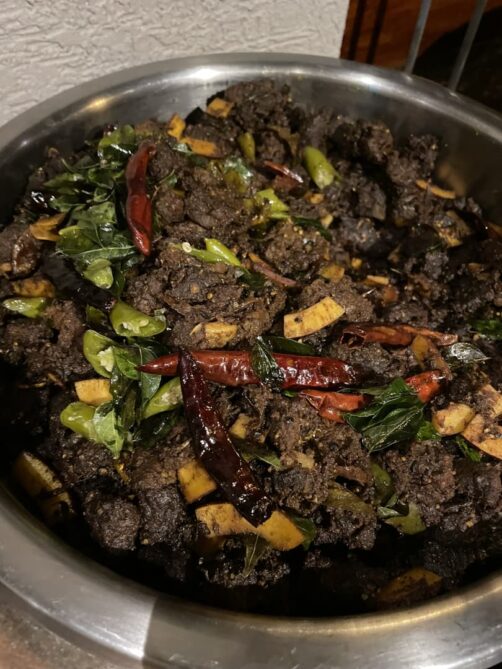 Les deux spécialités vraiment typiques, qu’on retrouve le plus dans les restaurants, sont le chutney de coco (souvent accompagné d’un deuxième chutney à la tomate) et le « coconut beef« , une préparation de boeuf frit à la coco.