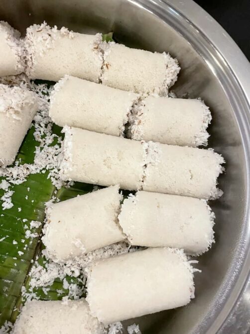 Enfin, au petit-déjeuner, vous retrouverez souvent une autre préparation à base de coco (et de farine de riz), le poutou. Assez sec, il se consomme plutôt accompagnés de currys ou autres plats en sauce.