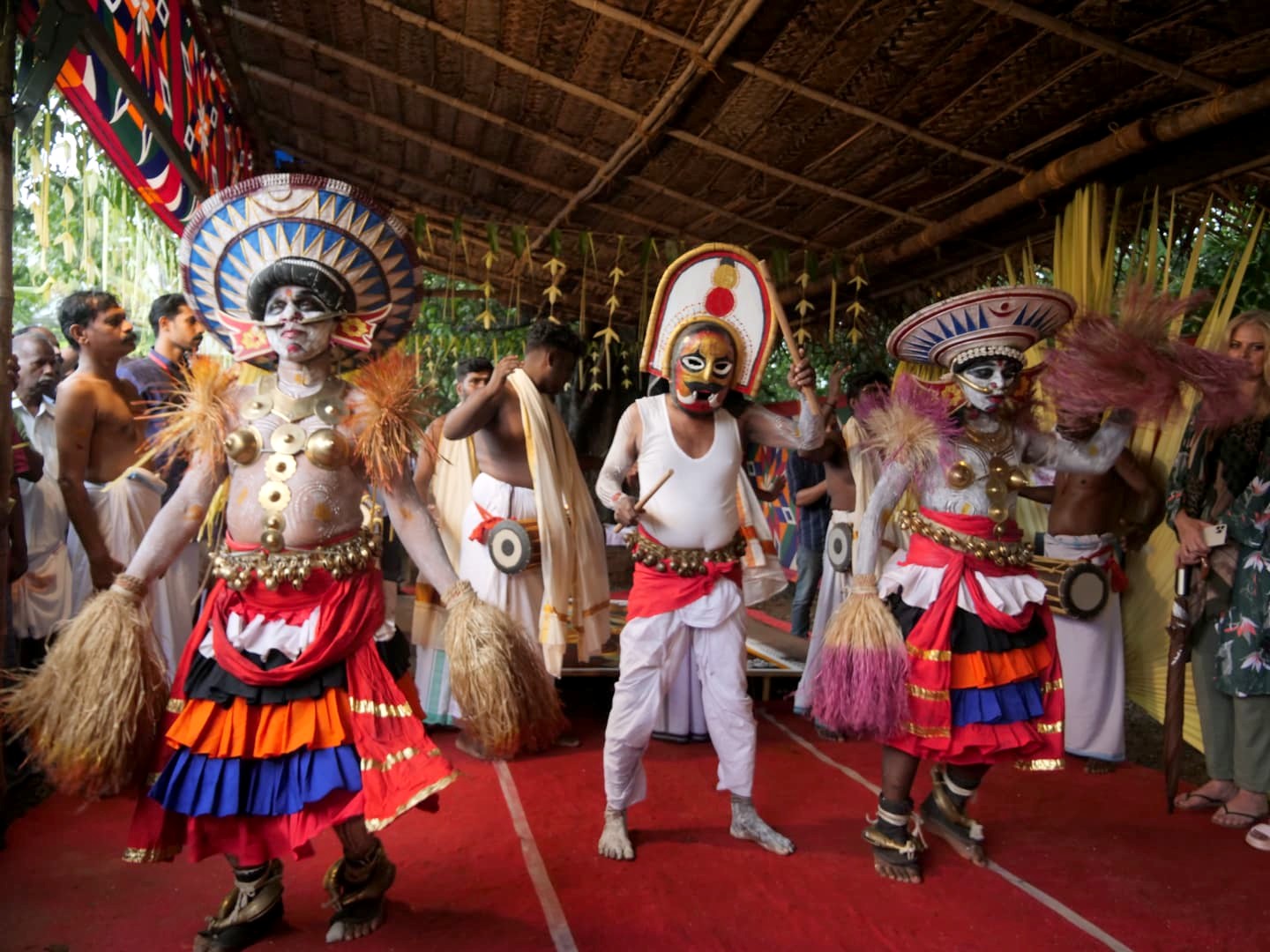 Comme notre voyage ne coïncidait pas avec un festival, la compagnie de tourisme responsable The Blue Yonder nous avait préparé une petite démonstration de quelques unes des danses et performances qui ont normalement lieu durant le festival Onam, le grand festival de la moisson qui a lieu en août-septembre. C’était vraiment intéressant !