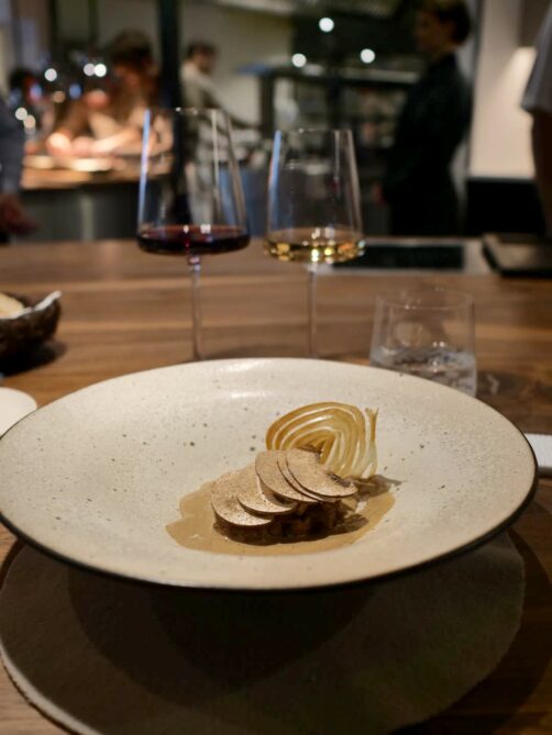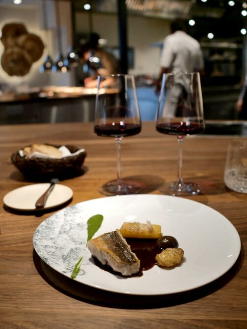 Nous passons ensuite à la première entrée, et mon coup de cœur du repas : un moelleux d’oignons doux des Cévennes et cèpes. Simple mais si gourmand (avec une sauce parfaite), et avec deux propositions d’accords vins très différents mais qui fonctionnent tous les deux très bien : un blanc, Pure du Domaine de La Barroche (2021) ou un rouge, le Château Moore du Tendre Prestige (2020).