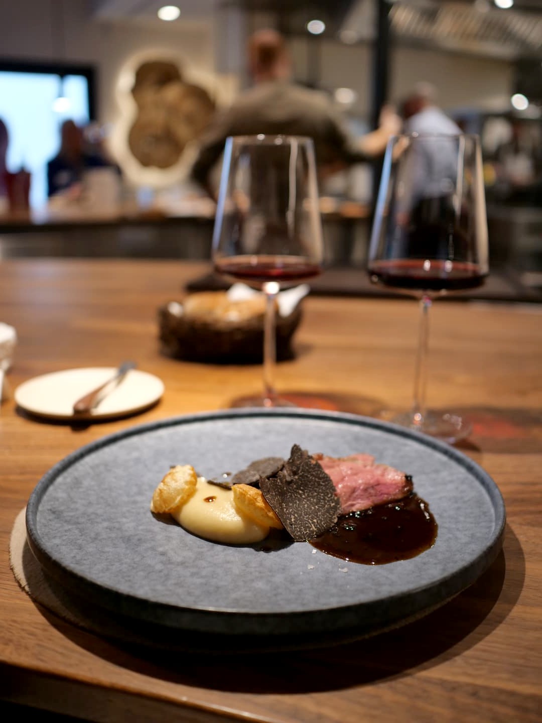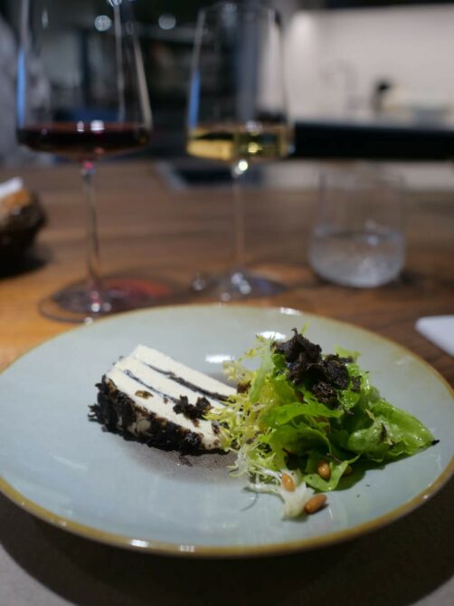 Ce n’est pas encore l’heure du dessert, mais l’ultra gourmand Brillat-Savarin à la truffe préparé par le chef est encore mieux qu’un gâteau pour les amateurs de fromage ! D’ailleurs, saviez-vous que cette spécialité avait été tout spécialement créée pour la dégustation de vins ? Pour l’accompagner au mieux, dans nos verres : un blanc, le Domaine Clef de Saint-Thomas (2021) et un rouge, le Domaine Prieuré des papes, Couchant (2019).