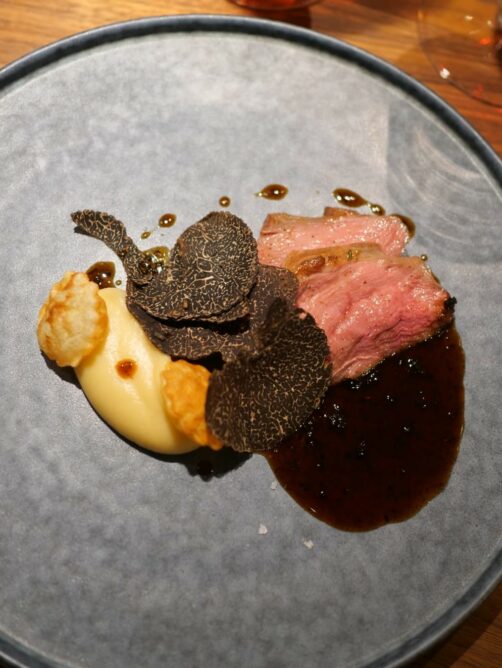 Pour le plat de consistance, le chef nous avait préparé un plat assez classique mais parfaitement excécuté à base de canard Burgaud, accompagné par une sauce périgourdine et une touche de truffes. En accord, deux rouges montrant bien la diversité des Châteauneuf-du-Pape : Le Vieux Donjon (2020) et le Chapoutier, Cuvée Barbe Rac (2012) – un de mes coups de cœur vin du jour !