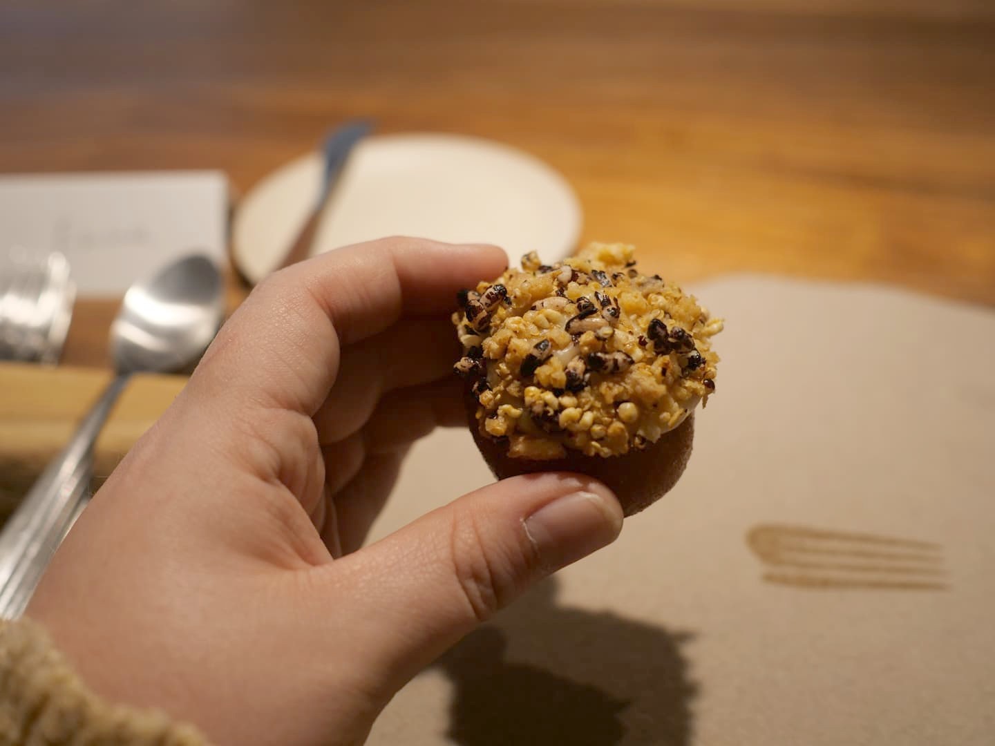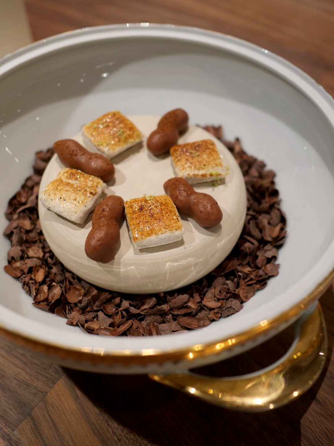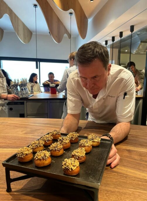 Nous observons à l’œuvre le chef et son équipe, qui nous ont préparé tout un repas en parfait accord avec les vins de Châteauneuf-du-Pape. Les premières dégustations arrivent rapidement, avec tout d’abord une série de mises en bouche joliment présentées : gaspacho de chou rouge et glace à la moutarde, tartare de veau avec noisettes et mayonnaise à la moelle de bœuf, et enfin ma préférée : la brioche japonaise, sauce soubise et céréales soufflées.