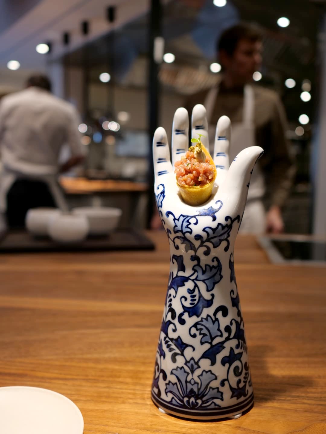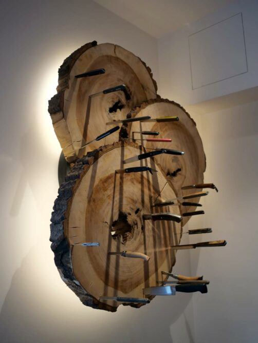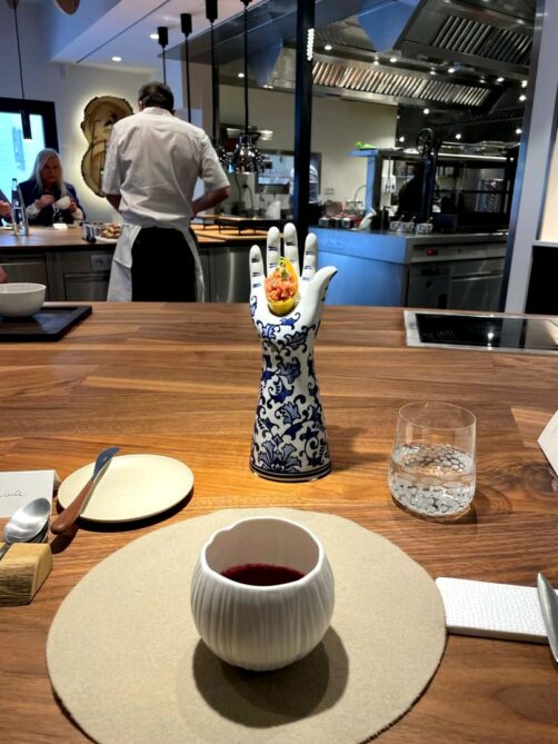 Il est l’heure de s’installer autour de cette grande table partagée pour commencer la dégustation tant attendue. Petit détail amusant : le chef propose de choisir son couteau sur un « arbre à couteaux » qui regroupe une série de couteaux qu’il a reçu de chefs, clients ou amis. À chacun son style !