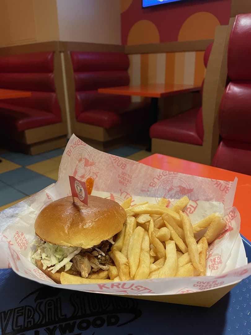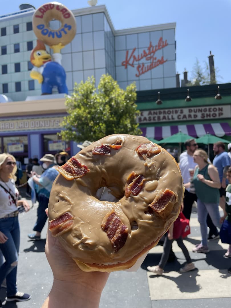 A part un donut bacon et sirop d’érable plutôt bon dans le restaurant Simpsons de la zone Springfield, le reste de la nourriture que nous avons goûté dans ce parc m’a un peu déçue par rapport à la qualité à laquelle m’avaient habitués les autres parcs Universal. Ca n’a pour moi rien à voir avec la bouffe à Osaka, ou même dans les parcs de Floride qui ont quelques restos considérés comme parmi les meilleurs restos de parcs d’attractions au monde. Au moins, les tarifs ne sont pas trop elevés (pour Los Angeles).