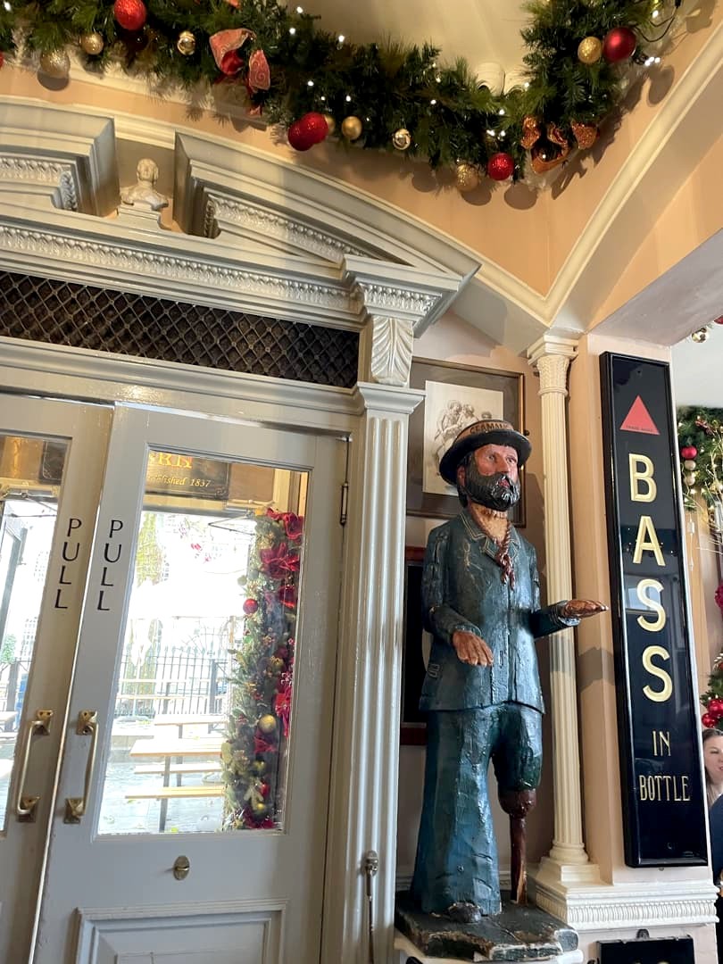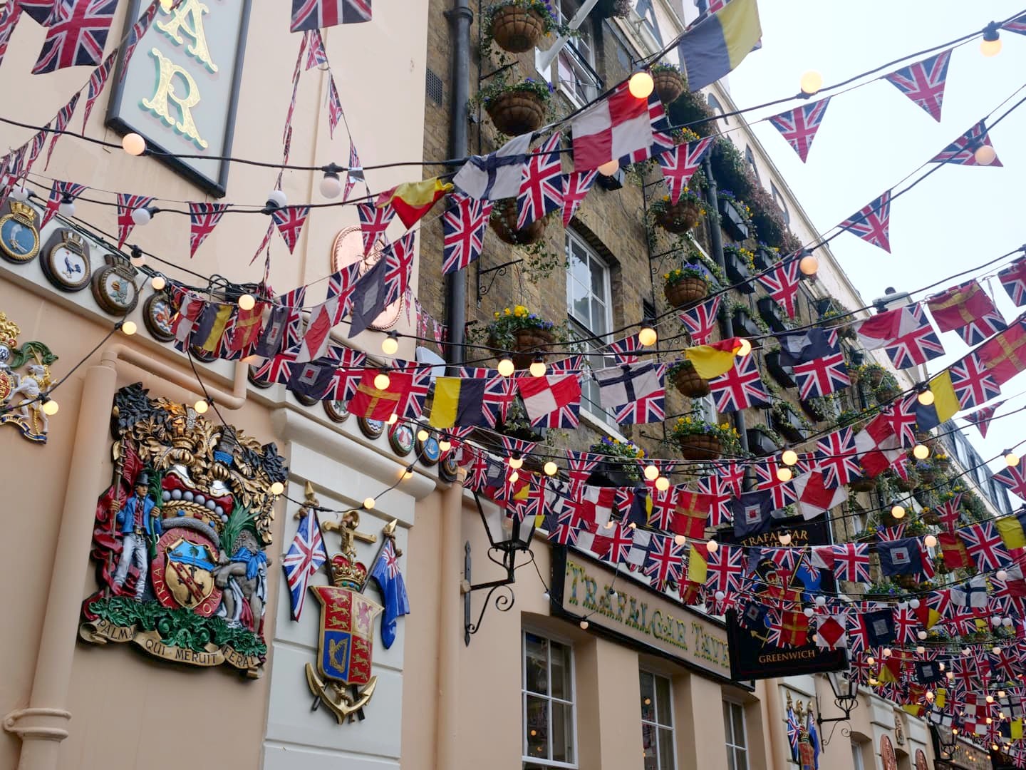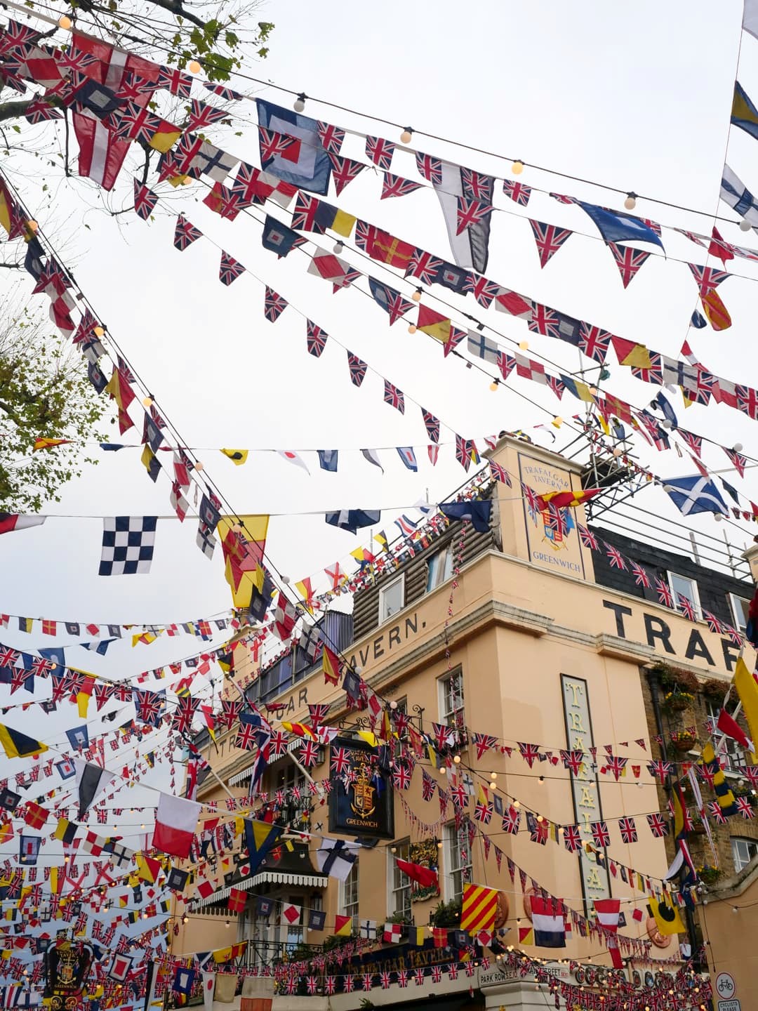 À l’autre extrémité du Old Royal Naval College, notre œil est attiré par une multitude de drapeaux. Cette décoration un peu tape-à-l’œil est celle de la Trafalgar Tavern, un pub historique, dernier survivant de l’époque où le quartier de Greenwich était particulièrement prisé pour aller manger des repas de « whitebait » (petits poissons) le long de la Tamise. Il a d’ailleurs été fréquenté par de grands noms tels que Charles Dickens, Turner, Richard Doyle, etc.