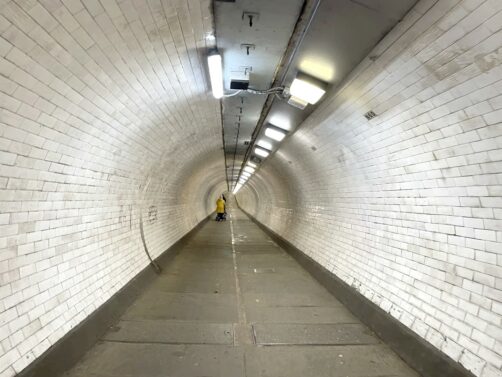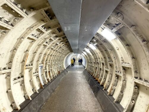 - à pied : rejoindre Greenwich depuis le centre de Londres, c’est long ! Par contre, si vous avez le temps, je vous recommande de prendre la DLR Line ou la Elizabeth Line jusqu’à Canary Wharf, puis de marcher de Canary Wharf à Greenwich, d’abord en longeant les quais, puis en traversant l’insolite Mudchute Park and Farm (un parc avec une ferme en plein Londres !) et enfin en empruntant l’encore plus insolite Greenwich Foot Tunnel, un tunnel piétonnier du début du 20ème siècle qui passe à 15 mètres de profondeur sous la Tamise (mais il y a un ascenseur).