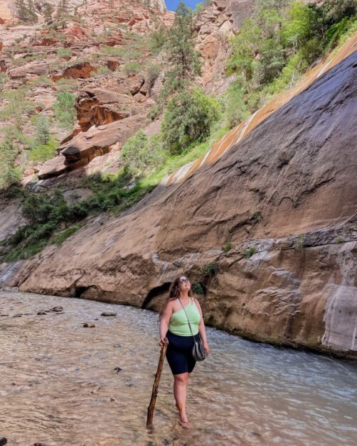 Nous commençons par la petite randonnée de Canyon Overlook Trail. Puis, Monsieur n’ayant pas gagné la lotterie d’Angels Landing, c’est finalement à deux que nous faisons l’autre randonnée star du parc (et beaucoup plus adaptée si vous souffrez comme moi du vertige) : The Narrows, une gorge que l’on remonte les pieds dans l’eau. Sympa et raffraîchissant avec la chaleur !