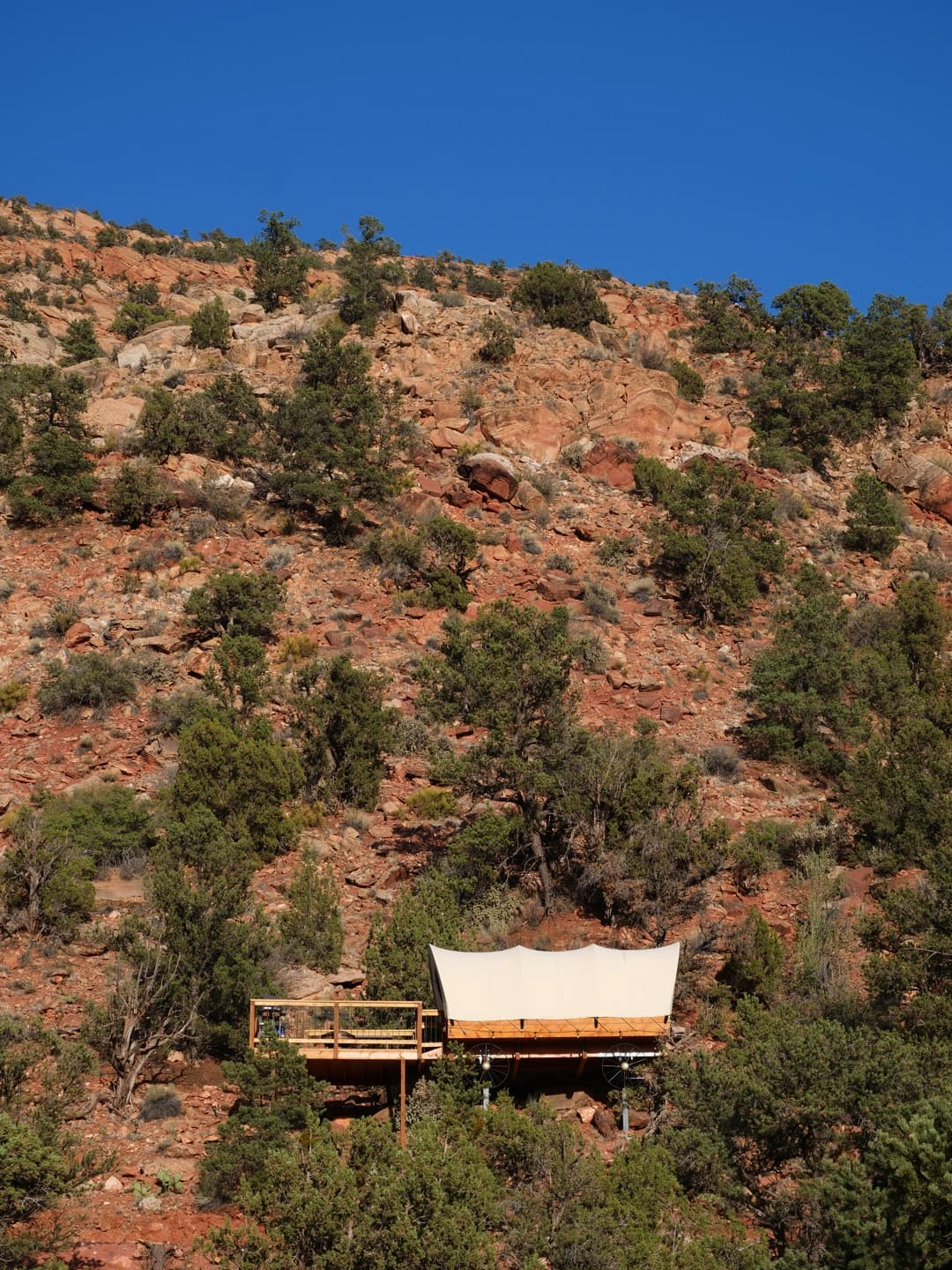 Hébergement : 1 nuit en territoire mormon à Hildale / Colorado City, au Zion View Camping, une chouette adresse glamping (bien moins chères que celles plus proches du parc) avec des tipis et des chariots typiques de l’Ouest américain. Voir plus de photos et les tarifs actuels.