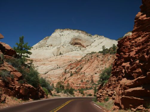 Direction ensuite Zion National Park, où nous arrivons en fin de matinée. Si Bryce Canyon nous a surpris positivement, ce fut un peu l’inverse pour Zion, et nous perdons déjà énormément de temps à l’arrivée à cause du système de circulation du parc (je vous explique dans l’article détaillé).