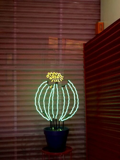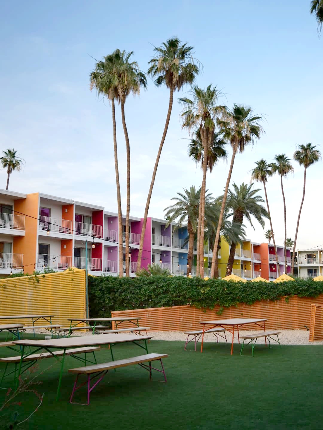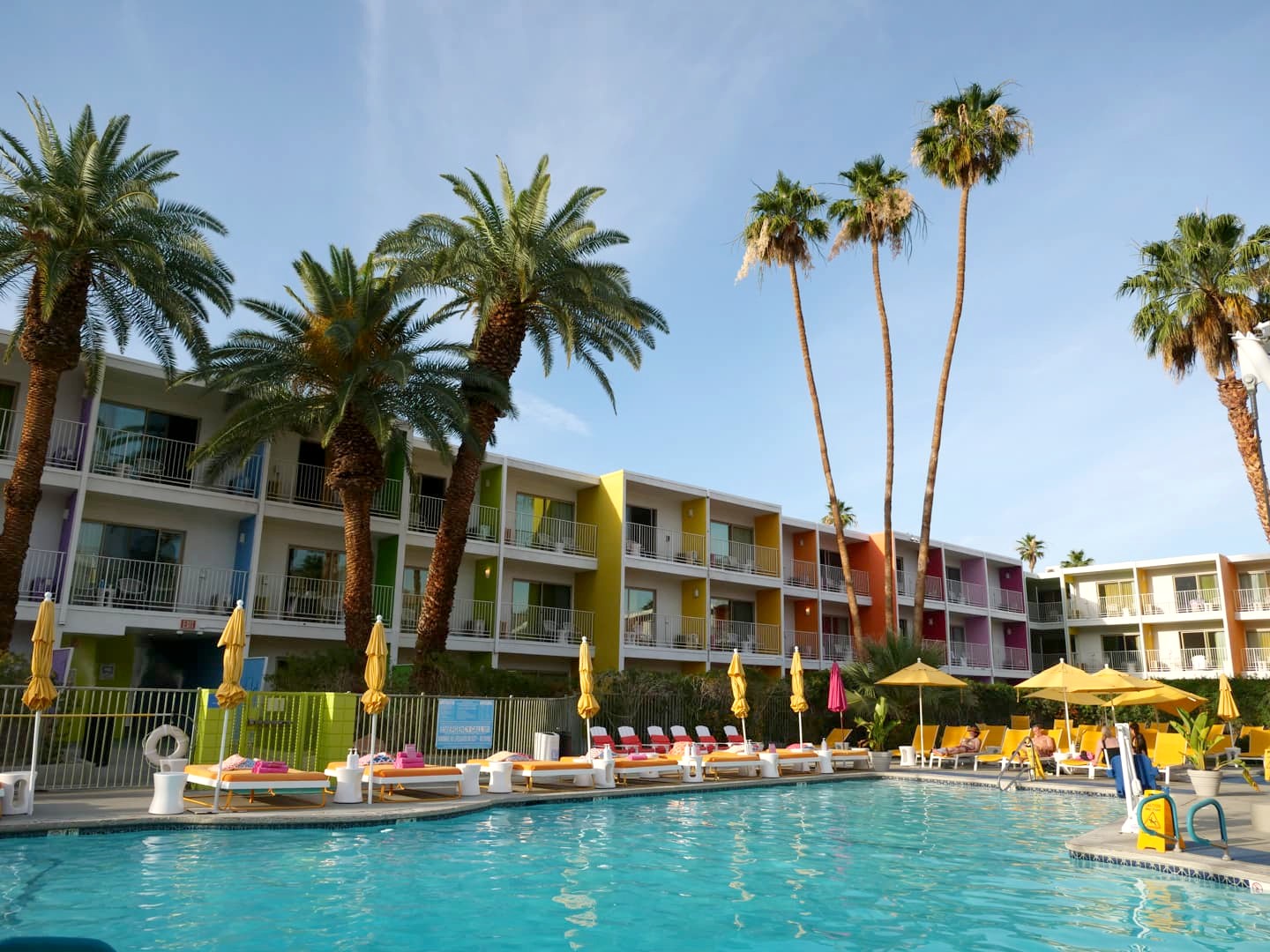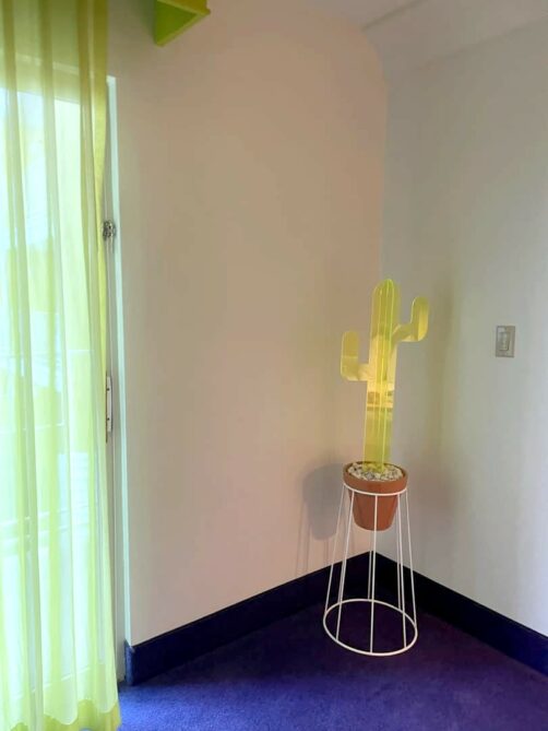 Après de longues hésitations (il y a tellement de belles adresses !), j’ai opté pour l’adresse la plus colorée et sans doute la plus vue sur Instagram : The Saguaro. Les « mauvaises notes » (relatives hein, c’est juste que je n’ai pas l’habitude de prendre des hôtels côtés moins de 8/10 sur Booking) m’avaient presque découragée à réserver cet hôtel, alors qu’il me faisait rêver depuis longtemps, avec sa piscine entourée de blocks aux couleurs de l’arc-en-ciel, qu’on retrouve également dans la déco des chambres et parties communes.