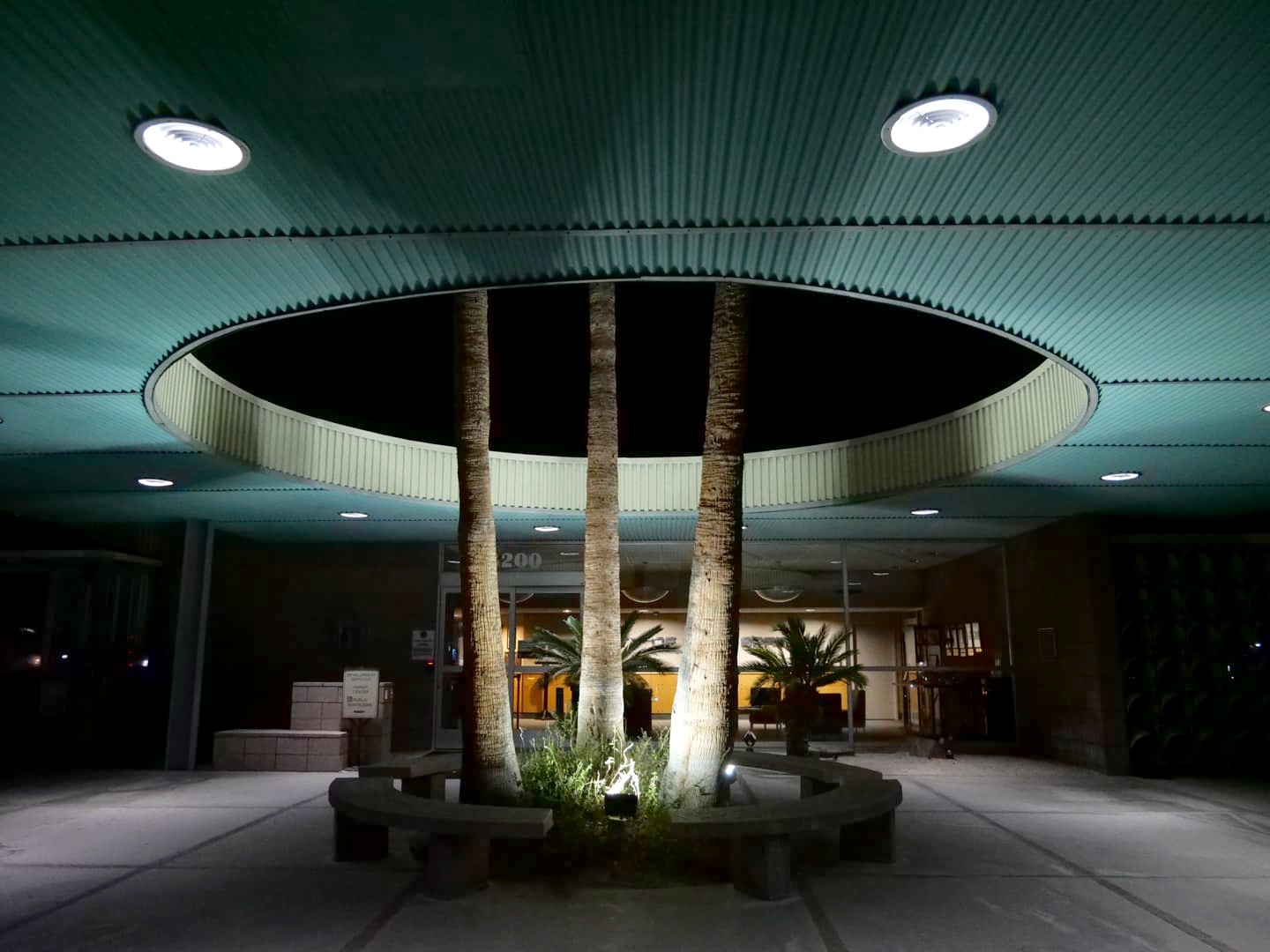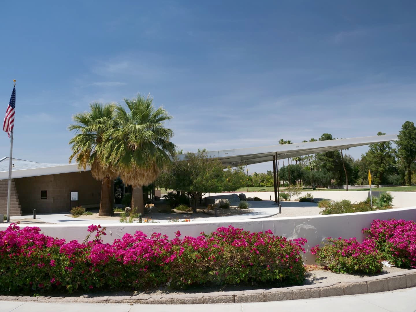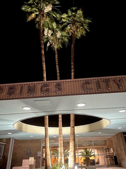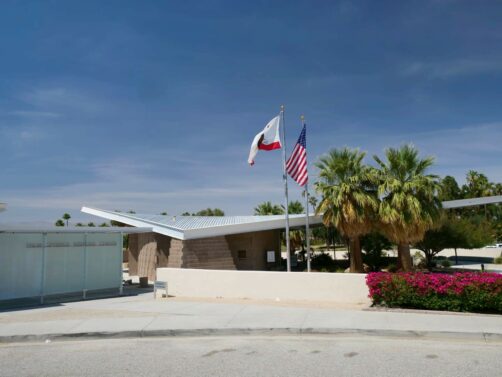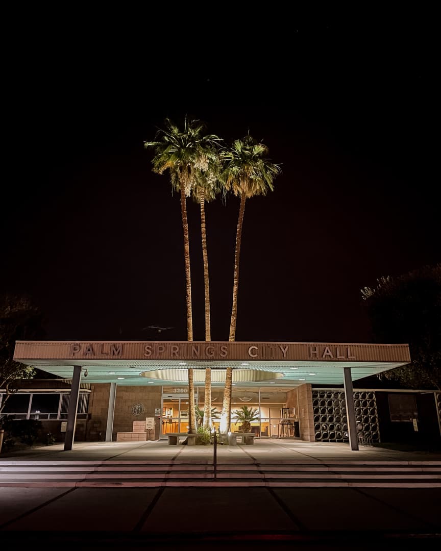- Palm Springs City Hall : une collaboration entre quatre des architectes les plus connus de la région, Albert Frey, E. Stewart Williams, Robson Chambers et John Porter Clark. Son architecture intrégrant les palmiers vaut également le coup d’oeil de nuit.