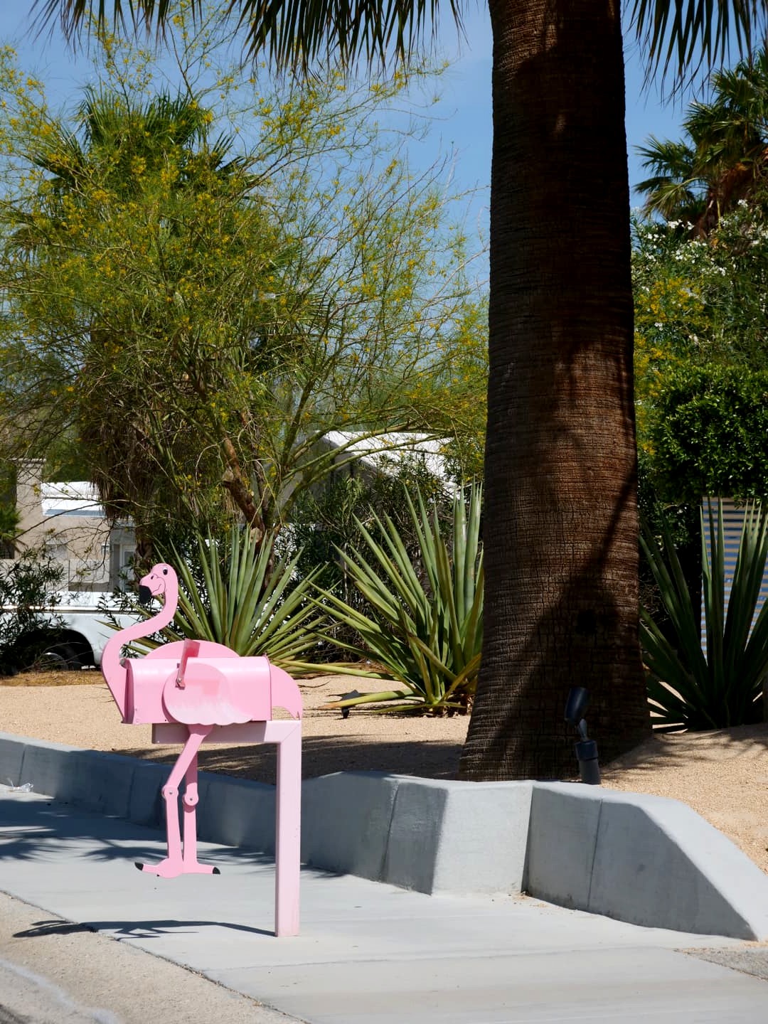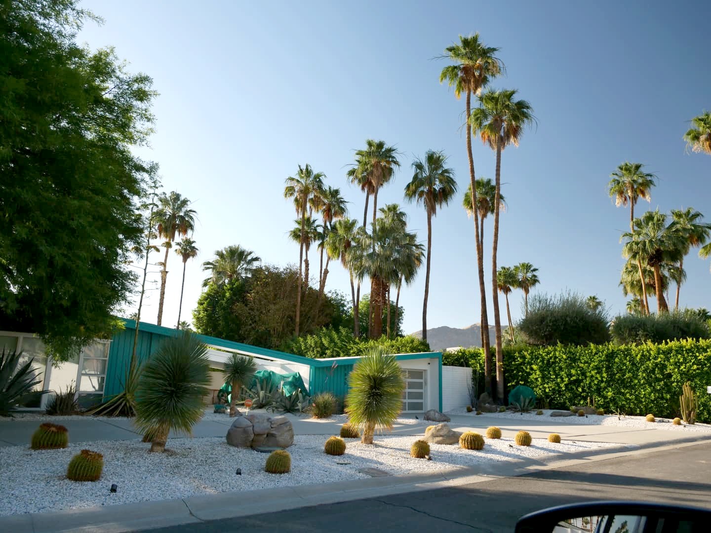 Une fois la carte en mains, c’est l’heure de commencer par un petit tour des maisons Mid-Century Modern de Palm Springs. Je vous recommande de commencer par là pour avoir directement un bon aperçu de la ville. Nous avons fait cette visite principalement en voiture (aucun problème pour se garer, il y a de la place partout) mais vous pouvez aussi envisager de faire ce tour à vélo (des visites guidées à vélo sont organisées). C’est principalement plat mais le problème reste la chaleur…