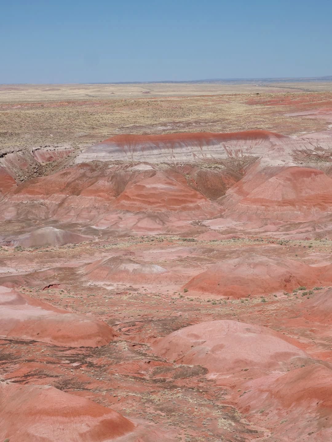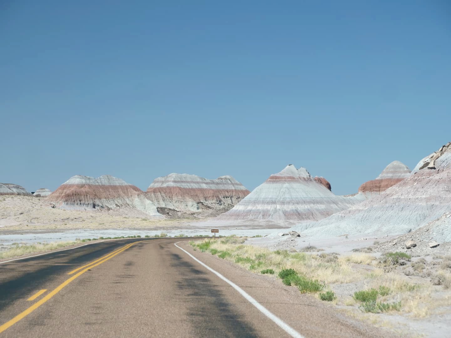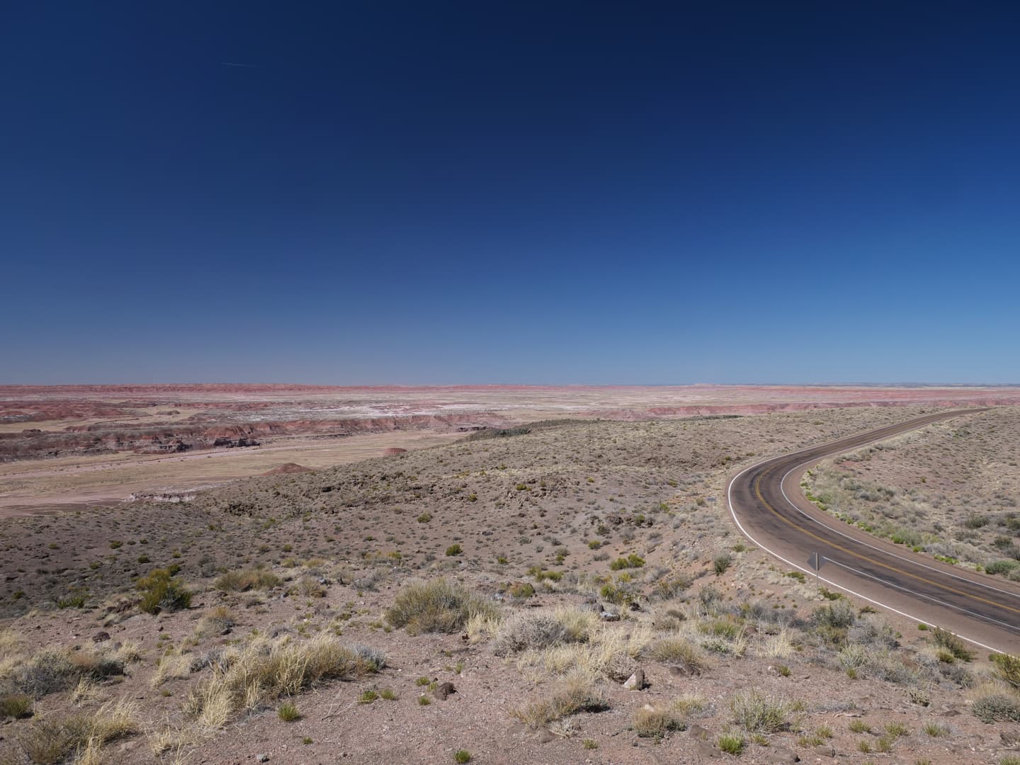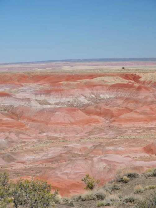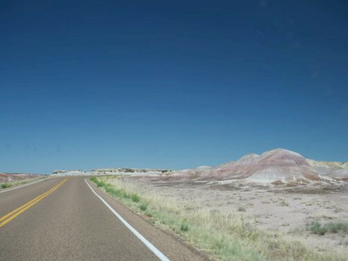 Après avoir passé un vestige de la Route 66, on entre dans la seconde partie du parc, Painted Desert, avec un soudain changement de couleurs. Après des badlands plutôt grisâtres dans la première partie, les paysages désertiques de Painted Desert sont plutôt dans les tons jaunes, oranges et rouges. C’est beaucoup plus coloré ! Les couleurs ressortent particulièrement en début et en fin de journée.
