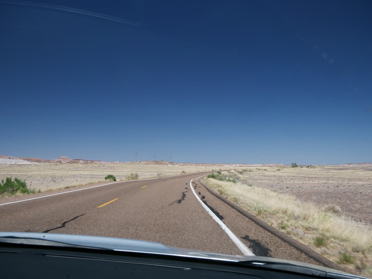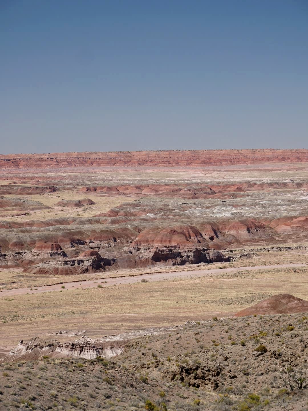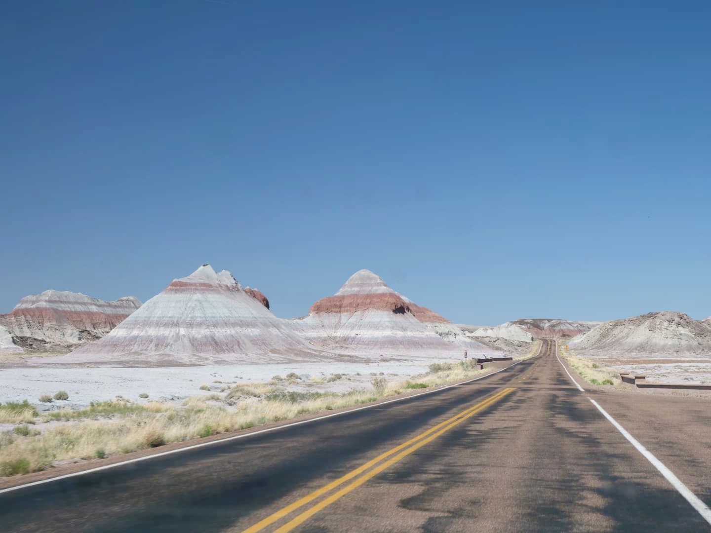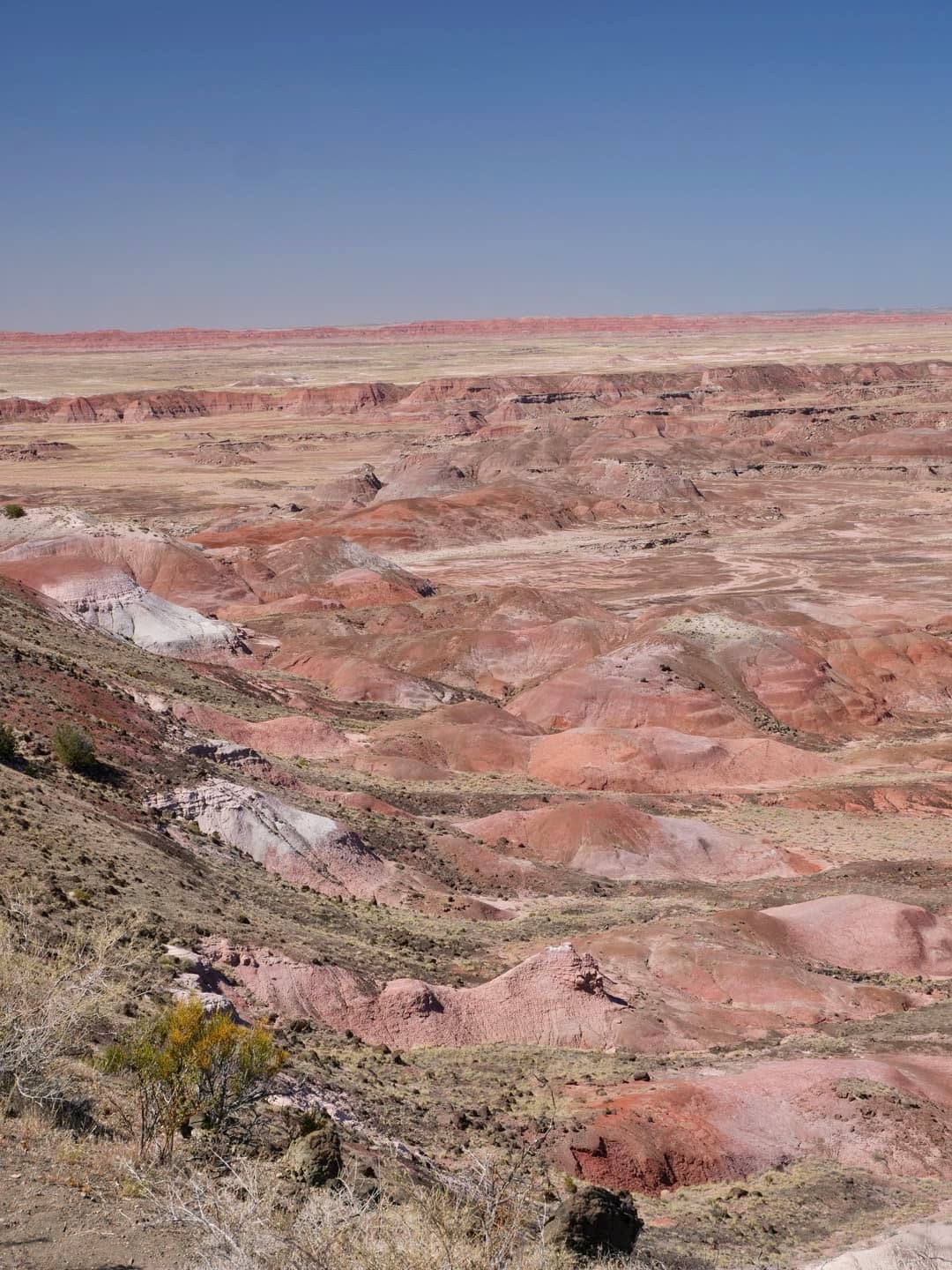 Après avoir passé un vestige de la Route 66, on entre dans la seconde partie du parc, Painted Desert, avec un soudain changement de couleurs. Après des badlands plutôt grisâtres dans la première partie, les paysages désertiques de Painted Desert sont plutôt dans les tons jaunes, oranges et rouges. C’est beaucoup plus coloré ! Les couleurs ressortent particulièrement en début et en fin de journée.