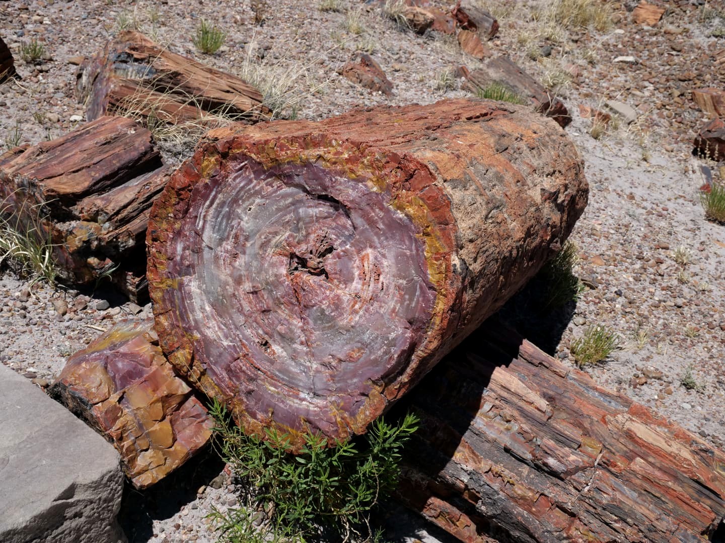 La « forêt » d’arbres pétrifiés du bien nommé Petrified Forest National Park contiendrait la plus grande concentration d’arbres fossilisés au monde. Ceux-ci ont pas moins de 200 millions d’années ! A l’époque, la région était bien différente, puisqu’à la place du désert actuel se trouvait des marécages et des grandes forêts de conifères, habitées par des dinosaures. Un long et complexe processus de fossilisation grâce à des dépôts sédimentaires riches en silice les a, au fil du temps, transformés en quartz.