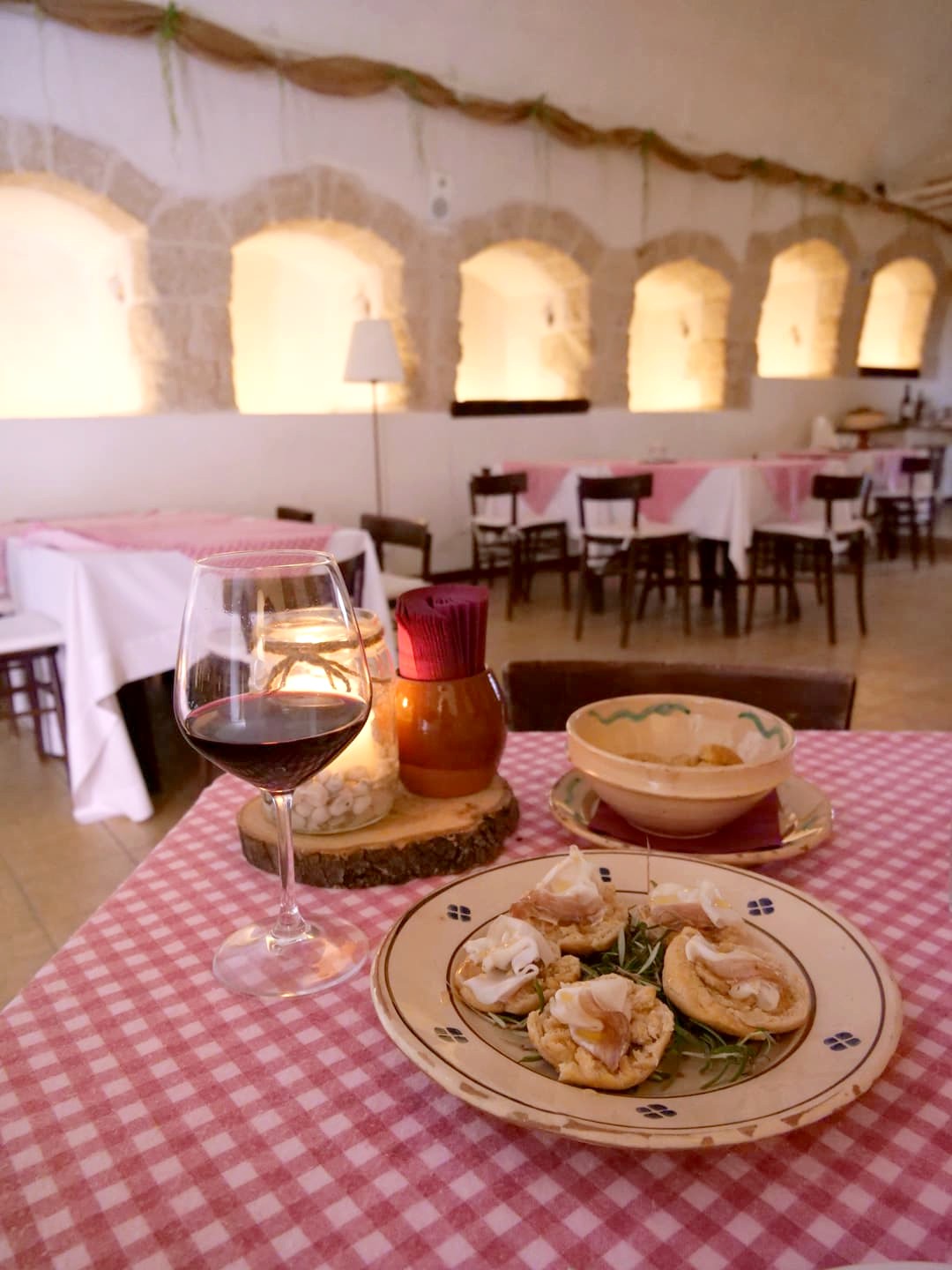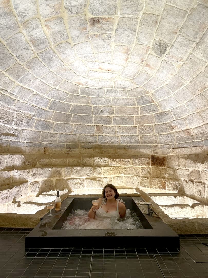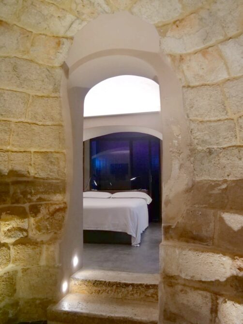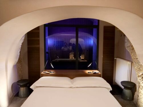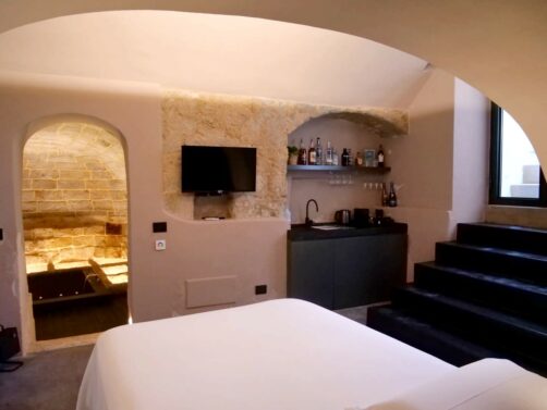 Nous avons passé la nuit à Monopoli au Borgo Albergo 35 Relax & Spa, un hébergement original qui se situe au bout d’une petite ruelle calme, en plein cœur de la ville. Le grand attrait de ce petit appartement cosy et romantique est son jacuzzi installé dans d’anciennes caves voûtées. Magique ! Il y a également un petit sauna, une salle de bain avec douche, et un petit espace cuisine (avec un mini-bar bien rempli).