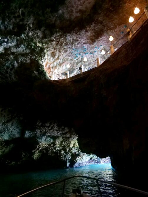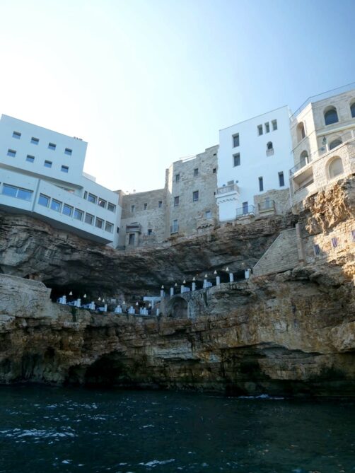 La balade passe également par la grotte du restaurant le plus célèbre des Pouilles (et qui se veut aussi être l’un des plus vieux restaurants d’Italie) : la Grotta Palazzese. Installé à l’intérieur d’une des grottes, ce restaurant possède il est vrai un cadre assez incroyable, mais pour les prix (vraiment exagérés pour même pas du « vrai » gastro), vu les avis mitigés que j’avais lu, on a décidé de ne pas le tester (ni l’hôtel dont il fait partie, encore plus hors de prix). Mais c’était quand même sympa de découvrir l’intérieur de la grotte depuis l’eau !