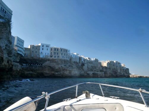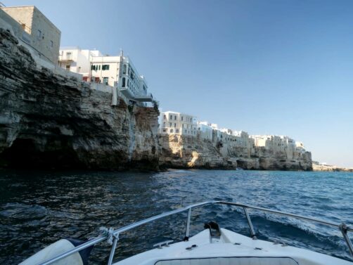 Heureusement, nous avions réservé une excursion en bateau, qui est pour moi la meilleure manière de profiter de la côte unique de Polignano a Mare sans la foule. Hors saison, il n’y a pas beaucoup de choix car certaines compagnies de bateau sont à l’arrêt (en haute saison, il y a pas mal de choix via GetYourGuide, qu’on utilise en général). Finalement, nous avons opté pour la seule option que nous avions trouvé pour ce jour-là, ce tour en petit bateau réservé via Viator. Et je peux vous dire que ce fut une excellente surprise !