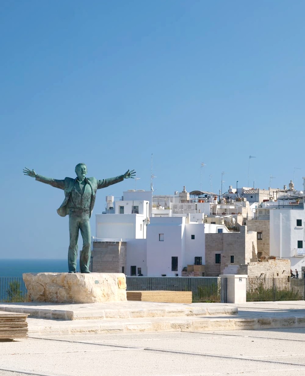 En retournant au parking gratuit situé près de la Grotta delle Rondinelle, on a tout de même été faire un petit coucou à Domenico Modugno. Même si celui-ci a toujours menti sur sa région d’origine, il a quand même eu droit à sa statue à Polignano !