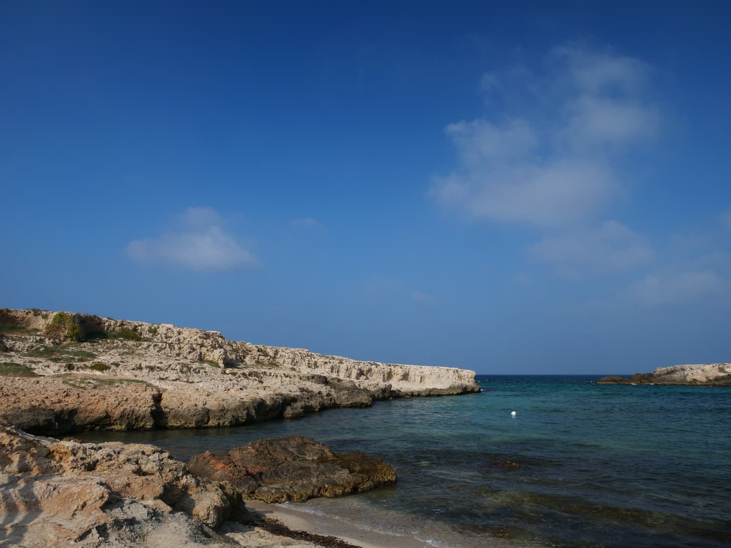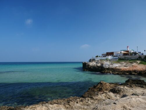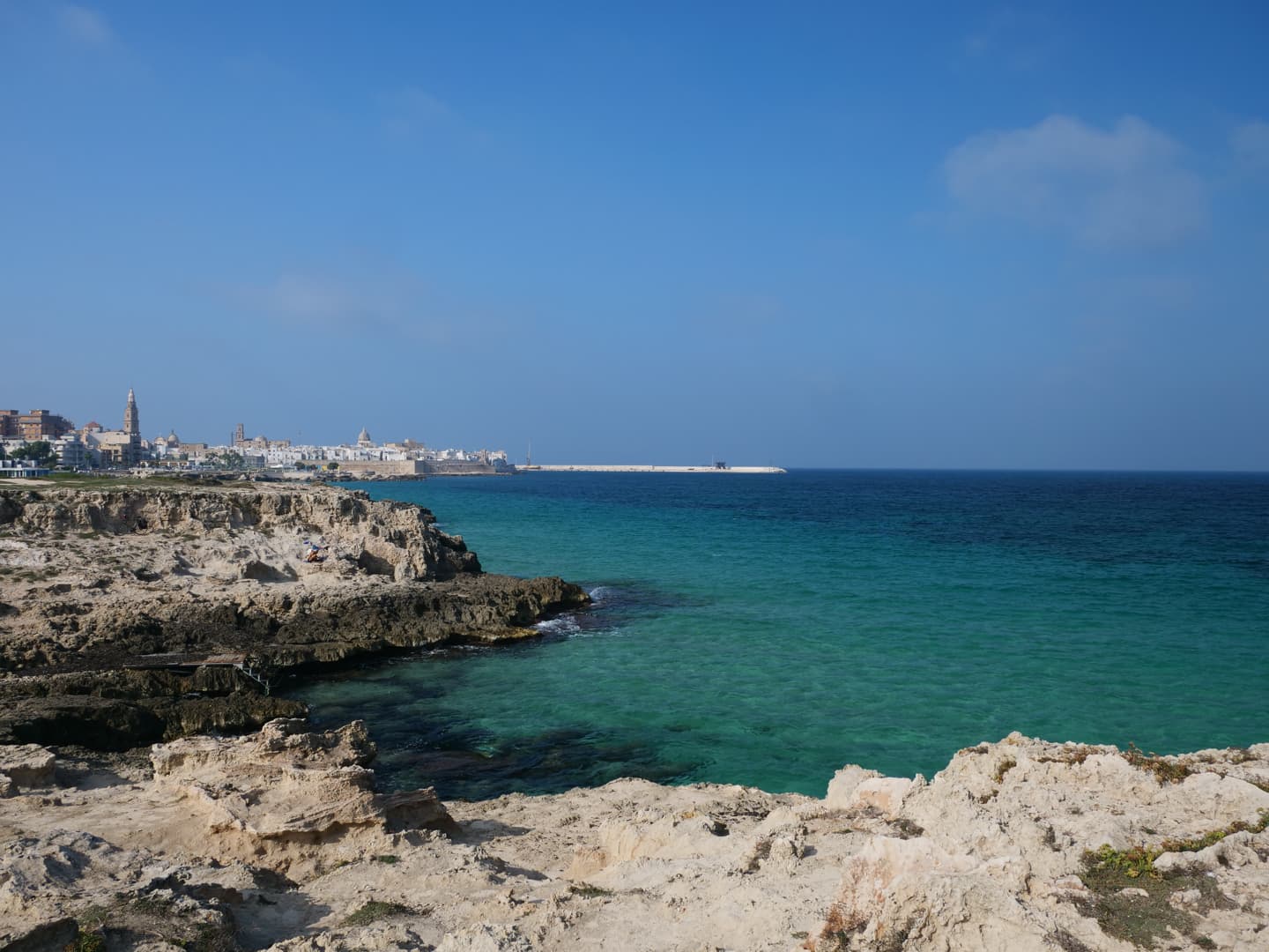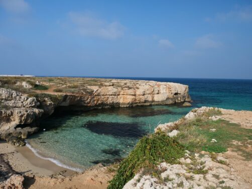 Avant d’explorer le centre de Monopoli, nous avons profité du soleil pour faire un agréable tour à pied en suivant le bord de mer, jusqu’à plusieurs plages situées au sud du centre-ville. Il y avait très peu de monde en cette saison, alors que des courants d’eau chaude (dès qu’on s’éloigne un peu du bord) rendent la baignade possible jusqu’à très tard dans la saison !