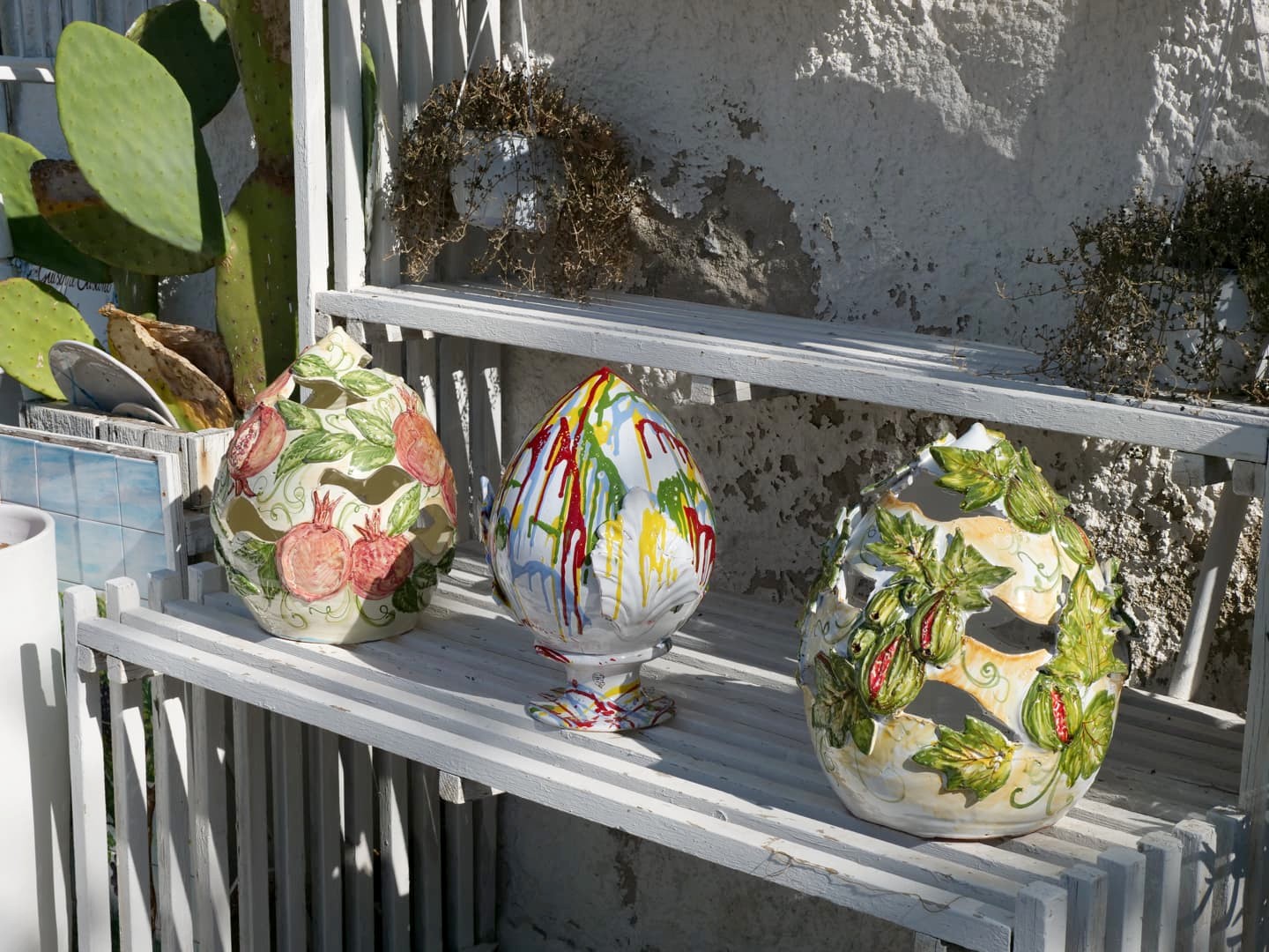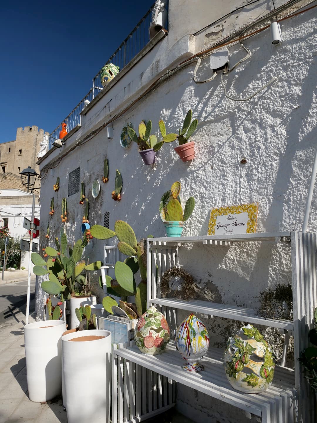 Il y en a pour tous les goûts et à tous les prix, même si globalement, vu la réputation de Grottaglie pour cet artisanat local, les prix ont tendance à être plutôt élevés. Il y a vraiment de belles choses, même si je ne peux malheureusement pas vous montrer grand-chose puisque la plupart des magasins de céramique interdisent les photos à l’intérieur.