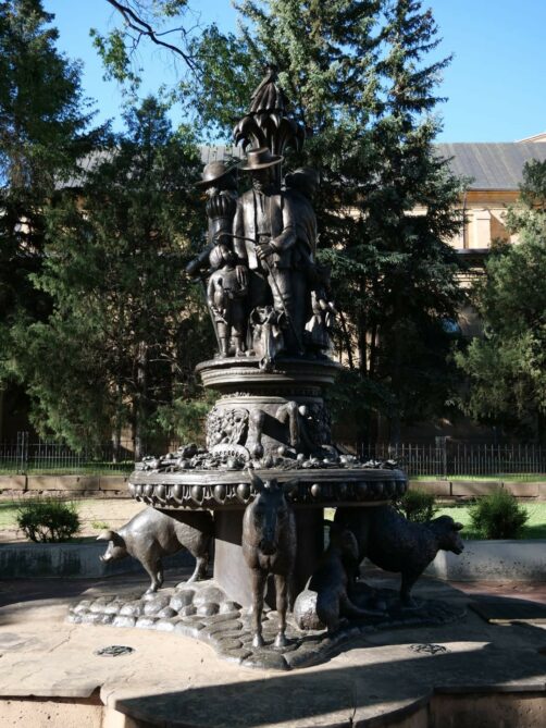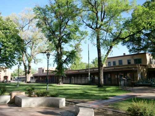 Classé National Historic Landmark, la Santa Fe Plaza est la grande place animée de Downtown Santa Fe. Celle-ci est bordée par plusieurs cafés et restaurants, ainsi que par le Palace of the Governors, plus vieux bâtiment public (1610) occupé de manière continue aux Etats-Unis, qui abrite aujourd’hui le New Mexico History Museum. Sous ses arcades, les indiens des pueblos voisins vendent traditionnellement y vendre leur artisanat (sauf que lors de notre visite en 2022, les mesures Covid étaient encore fort présentes, du coup on a un peu raté ça).
