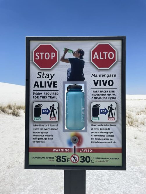 Pourquoi seulement quelques balades ? Car comme mentionné plus haut, le parc bénéficie d’un micro-climat très, très chaud ! Les accidents dus à la chaleur sont monnaie courante, c’est pourquoi de grands panneaux déconseillent de faire une longue randonnée lorsqu’il fait plus de 30 degrés Celsius (c’était le cas lors de notre visite). Il n’y a vraiment aucune ombre, l’insolation peut être rapide ! Même pour quelques centaines de mètres, prenez beaucoup d’eau avec vous. Nos Hydroflask sont les seules gourdes qui sont restées fraîches tellement il faisait chaud (pas étonnant que tout le monde utilise cette marque, que j’adore aussi, ici).