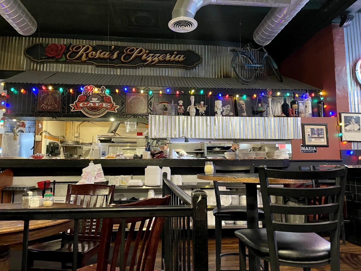 On hésitait à manger à l’hôtel ou ailleurs, mais finalement on tombe, un peu plus loin dans la rue principale, sur une pizzeria qui nous fait de l’oeil (après plusieurs jours de bouffe mexicaine) : Rosa’s Pizzeria. Cette pizzeria de style new-yorkais semble très populaire, et on comprend vite pourquoi. Même s’il s’agit d’une adresse assez récente, on remarque que le restaurant n’en est pas à sa première vie : je n’ai pas trouvé ce que c’était avant, mais il y a une grande carte vintage de la région sur un des murs.