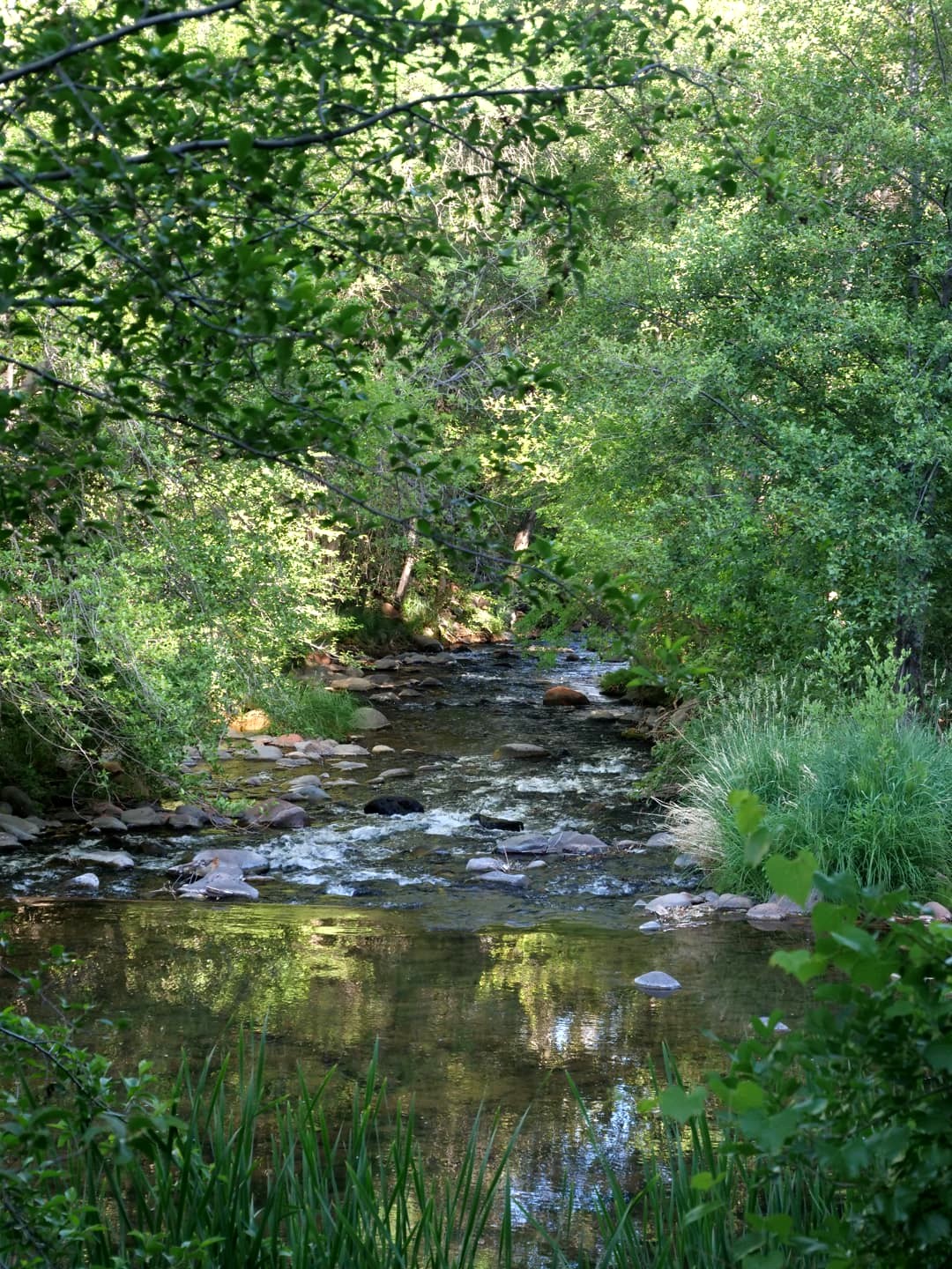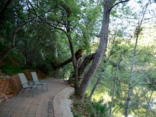 Une des raisons pour laquelle j’avais choici cet hôtel, c’était son espace piscine et jacuzzi avec vue sur les formations rocheuses de Sedona, et son accès direct à la Oak Creek, le cours d’eau qui longe la ville, et auquel on accède via un assez long escalier depuis l’hôtel. On ne s’y est pas baignés (l’eau était assez stagnante à cette période), mais le changement d’ambiance est total là en bas : on ne dirait plus du tout qu’on se trouve à Sedona !