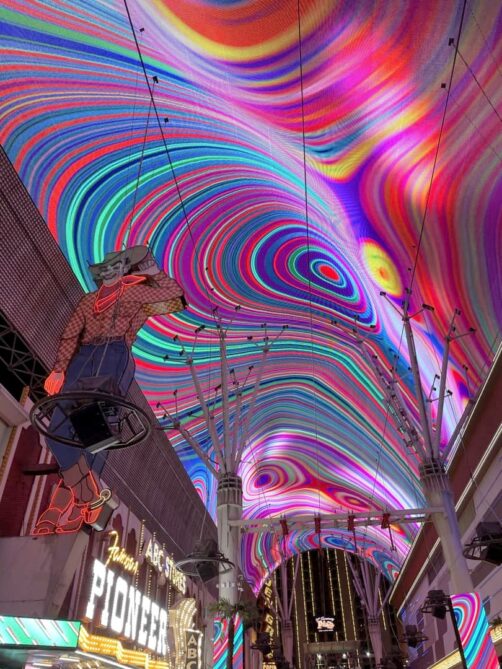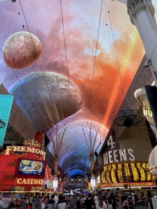 Le coeur de Downtown Las Vegas, c’est Fremont Street, une rue très animée, elle aussi entourée de casinos (même si à plus petite échelle que le Strip). Vu que la partie centrale de la rue est couverte sur 400 mètres et que la clim sort de tous les casinos, il y fait plutôt frais même si c’est à l’extérieur !