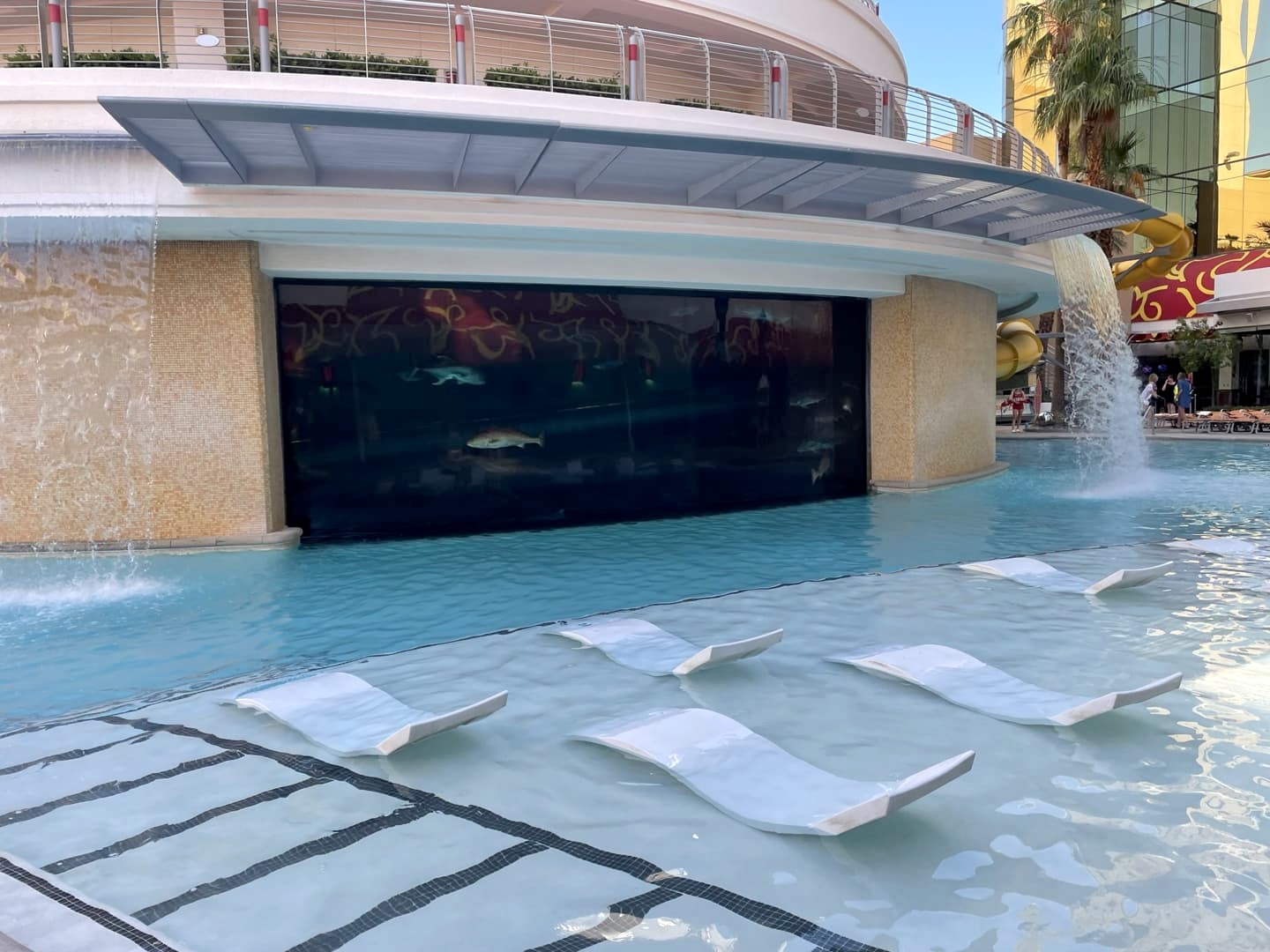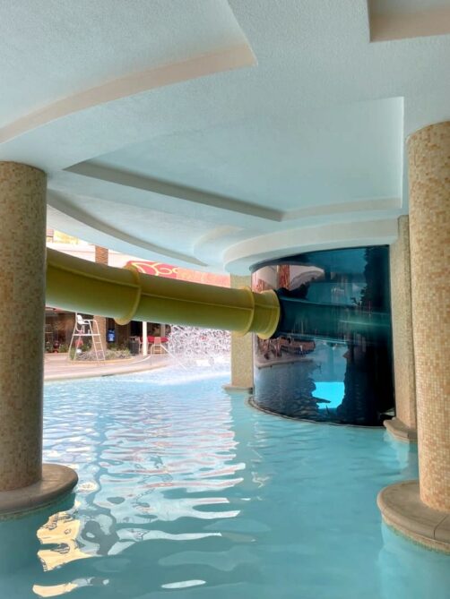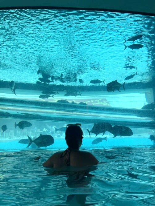 Si la chambre était spacieuse et assez confortable, mais la décoration est minime et j’ai surtout été déçue par la piscine. Les transats y sont entassés les uns sur les autres (vraiment pas agréable), mais il y a surtout en plein milieu de la piscine un aquarium avec des poissons et des requins, qui semblent tout aussi entassés. Un toboggan permet de passer à l’intérieur de l’aquarium, mais je n’en avais pas le coeur… Après réflexion, le Circa (adults only) aurait probablement été une meilleure option dans le quartier.