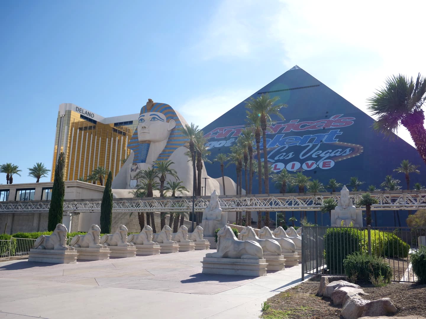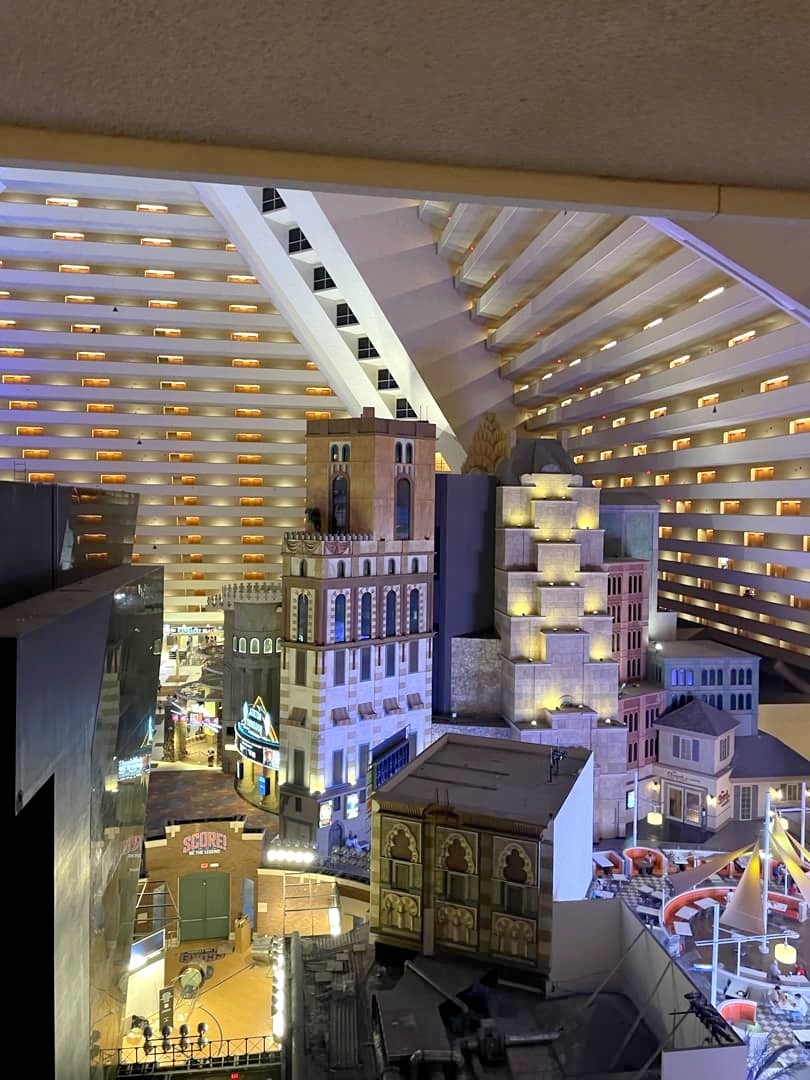 Nous avions une vue sur l’Excalibur depuis notre chambre, très spacieuse et très propre, avec ses murs penchés, assez original ! L’ascenseur est lui aussi unique au monde, puisqu’il suit aussi l’angle de la pyramide, et leur Lobby serait le plus grand haut monde. Bref, tout dans la démesure, comme partout à Vegas.