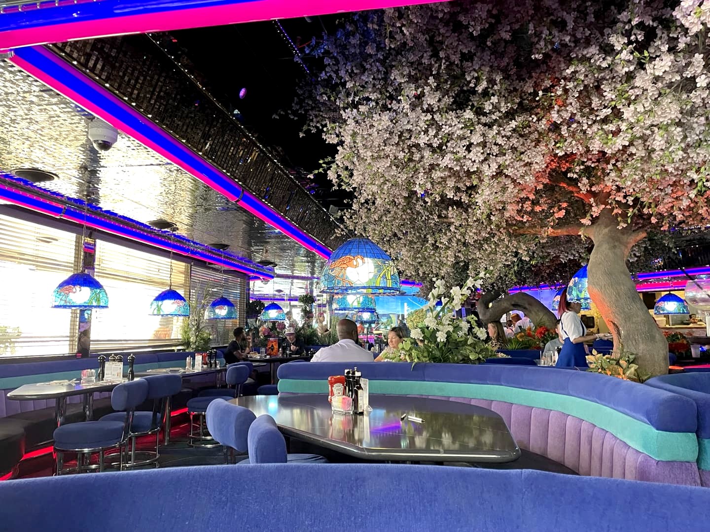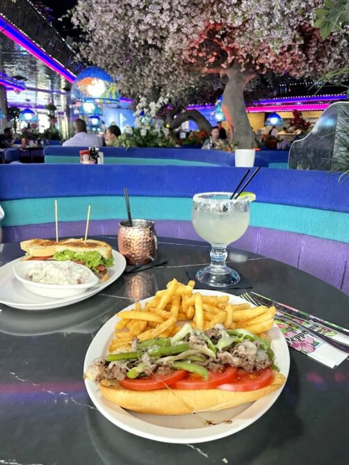 En grande amatrice d’adresses « vintage », je voulais absolument aller tester l’un des bars-restos iconiques du Strip : le Peppermill Restaurant & Fireside Lounge. Ouvert depuis 1972, cette populaire adresse a gardé aujourd’hui encore un côté très « seventies ».