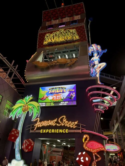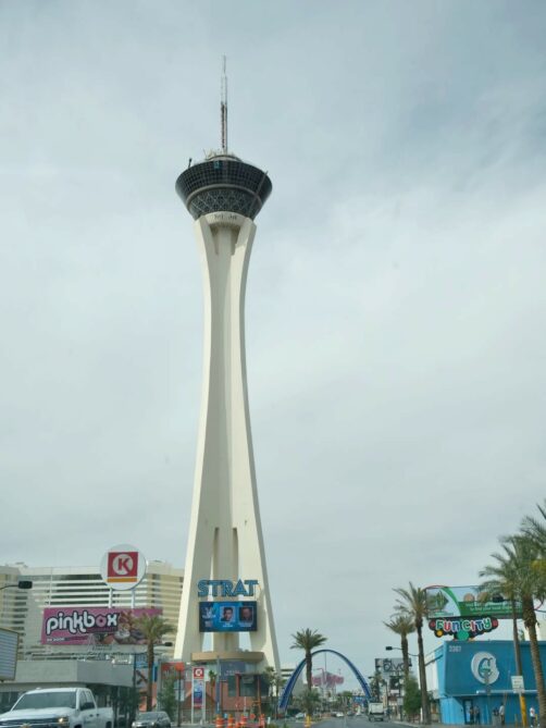 Plus au nord du Las Vegas Boulevard, juste avant d’arriver dans l’Arts District, se trouve un autre casino iconique de Las Vegas : le STRAT (anciennement Stratosphere). Cette haute tour que l’on voit de loin est connue pour sa plateforme d’observation mais aussi pour ses activités à sensation forte qui se trouvent également au sommet de la tour : Big Shot (simulateur), Insanity (où vous êtes suspendus au dessus du vide), XScream (roller coaster qui vous « jette » dans le vide), ou pour les plus aventureux, le SkyJump vous permet de sauter dans le vide depuis la tour…
