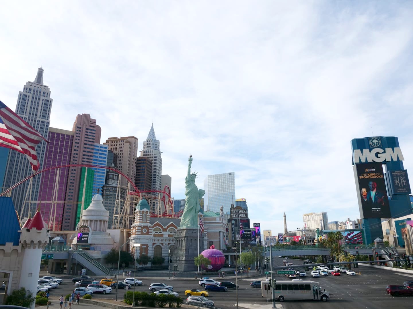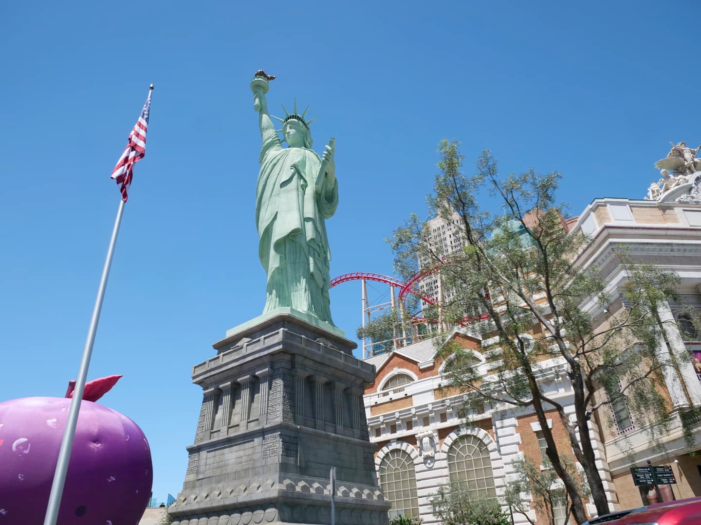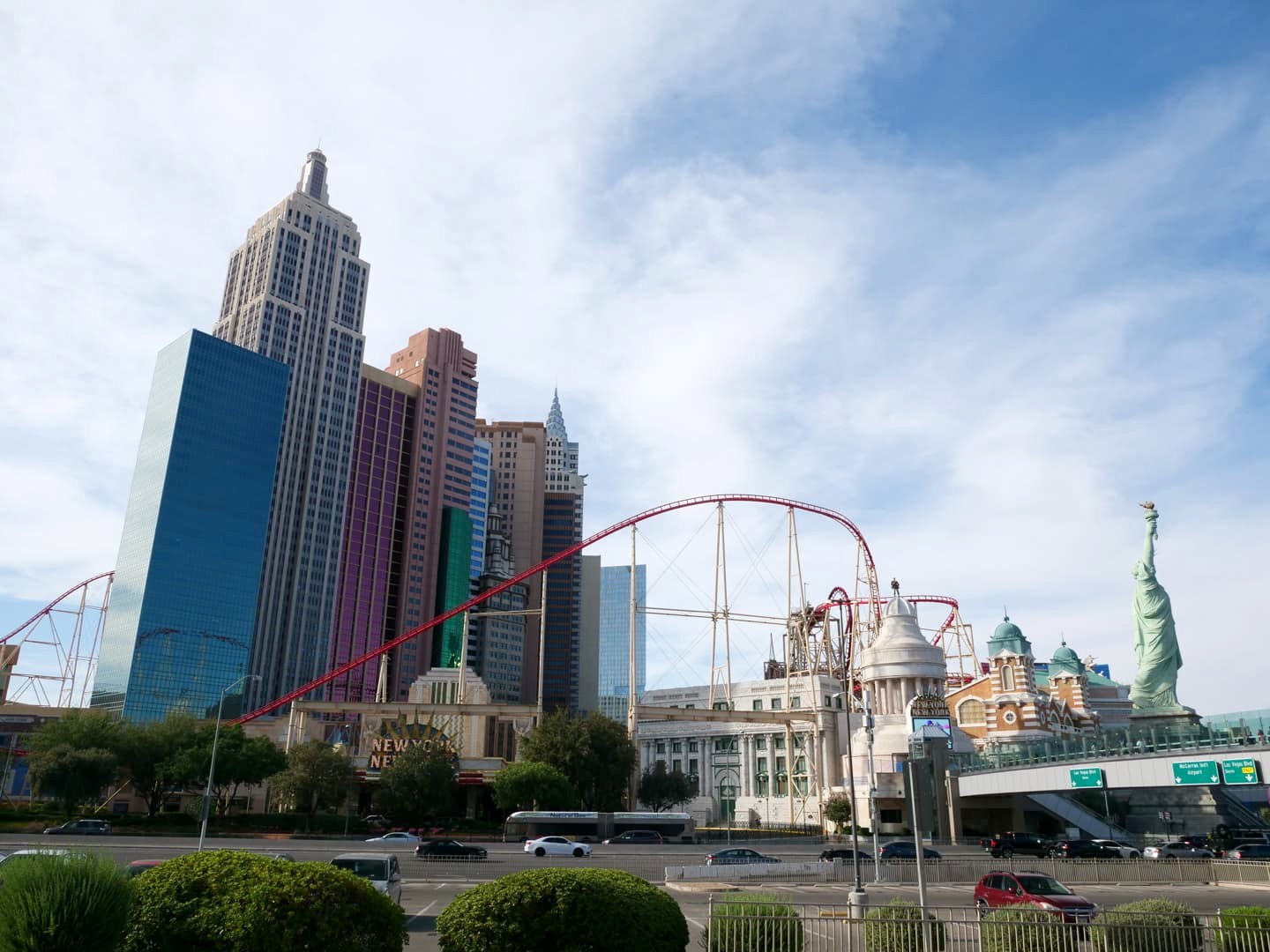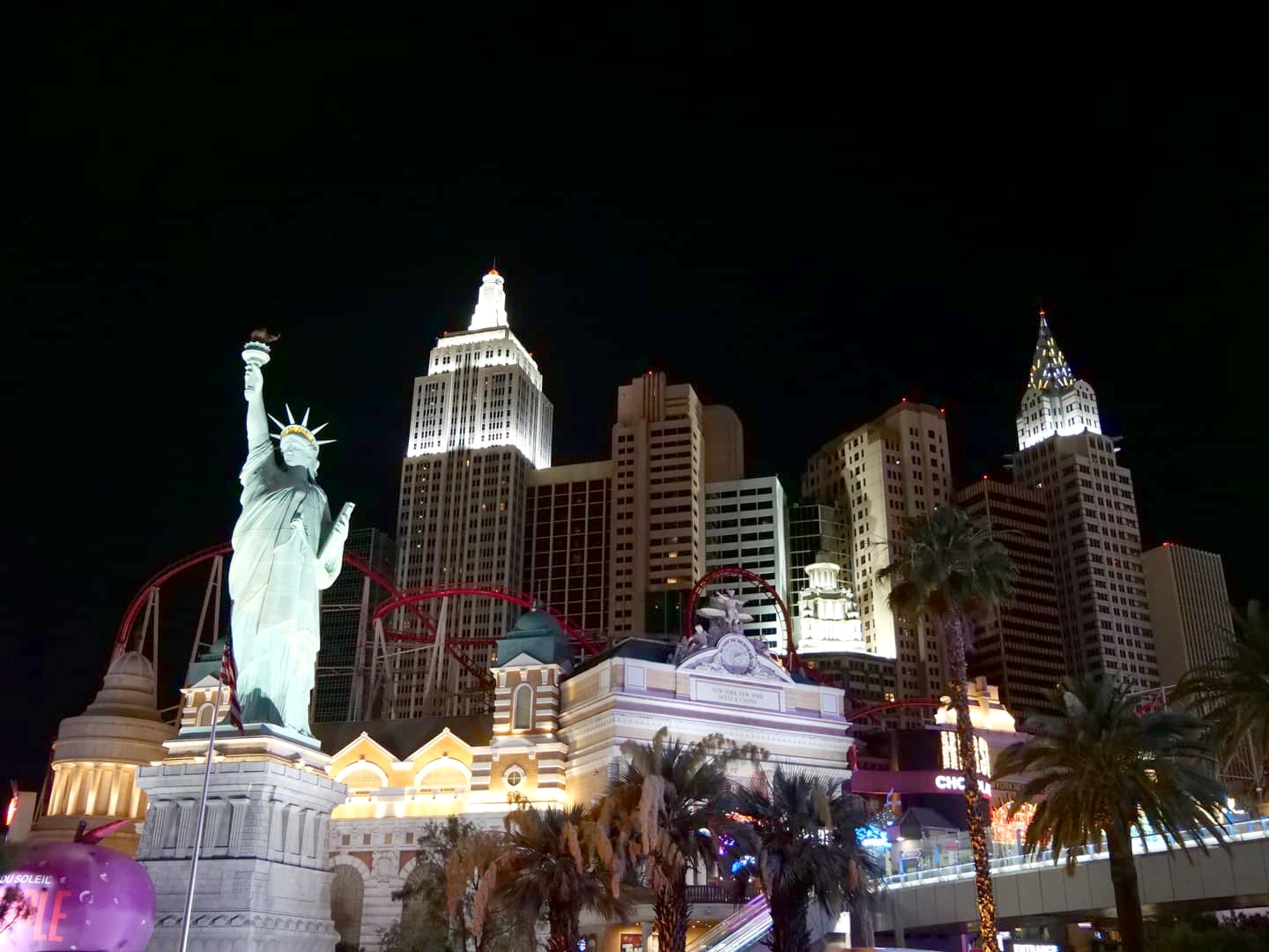 - 3 – New York New York : traversé par un roller-coaster (The Big Apple Coaster), cet hôtel-casino est également l’un des plus photogénique, avec sa reproduction de la Statue de la Liberté et des gratte-ciel newyorkais en extérieur, et des rues de New York à l’intérieur.