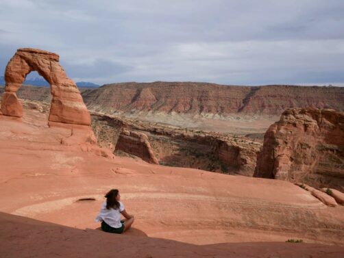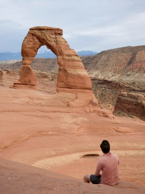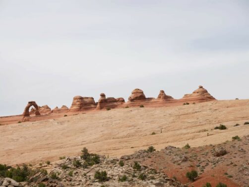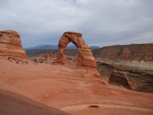 Nous avions gardé l’arche la plus connue pour la fin, car Delicate Arch est aussi l’un des endroits les plus populaires pour le lever et le coucher du soleil (ce sont à ces moments-là que les couleurs de l’arche sont les plus belles). On accède à celle-ci via une petite randonnée d’environ 5 km aller-retour. A l’aller, la montée est constante mais pas très difficile… surtout que le soleil avait justement décidé de se cacher à ce moment-là ! Je peux vous dire que pour une fois, j’étais contente de voir un peu disparaître le soleil…