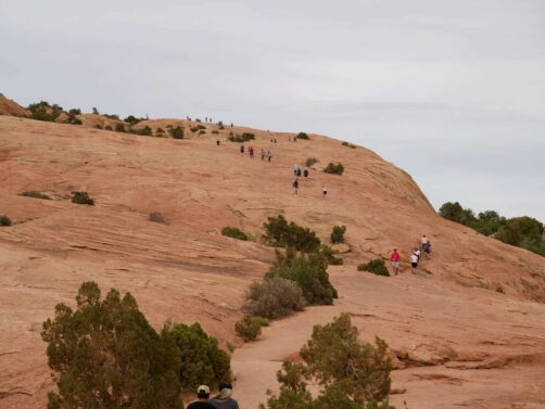 Si nous pensions à la base rester ici jusqu’au coucher du soleil (comme beaucoup de personnes qui attendaient déjà à notre arrivée), nous avons finalement abandonné, car le ciel se couvrait de plus en plus, et le vent ne faisait que s’emplifier. Attendre aurait aussi voulu dire redescendre dans le noir, et rater les heures d’ouverture des restos de Moab… Bref, la fatigue et nos estomacs ont décidé pour nous !