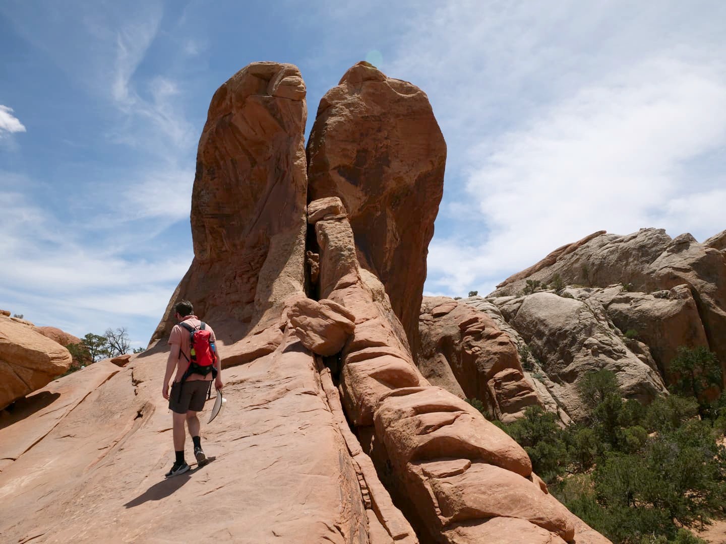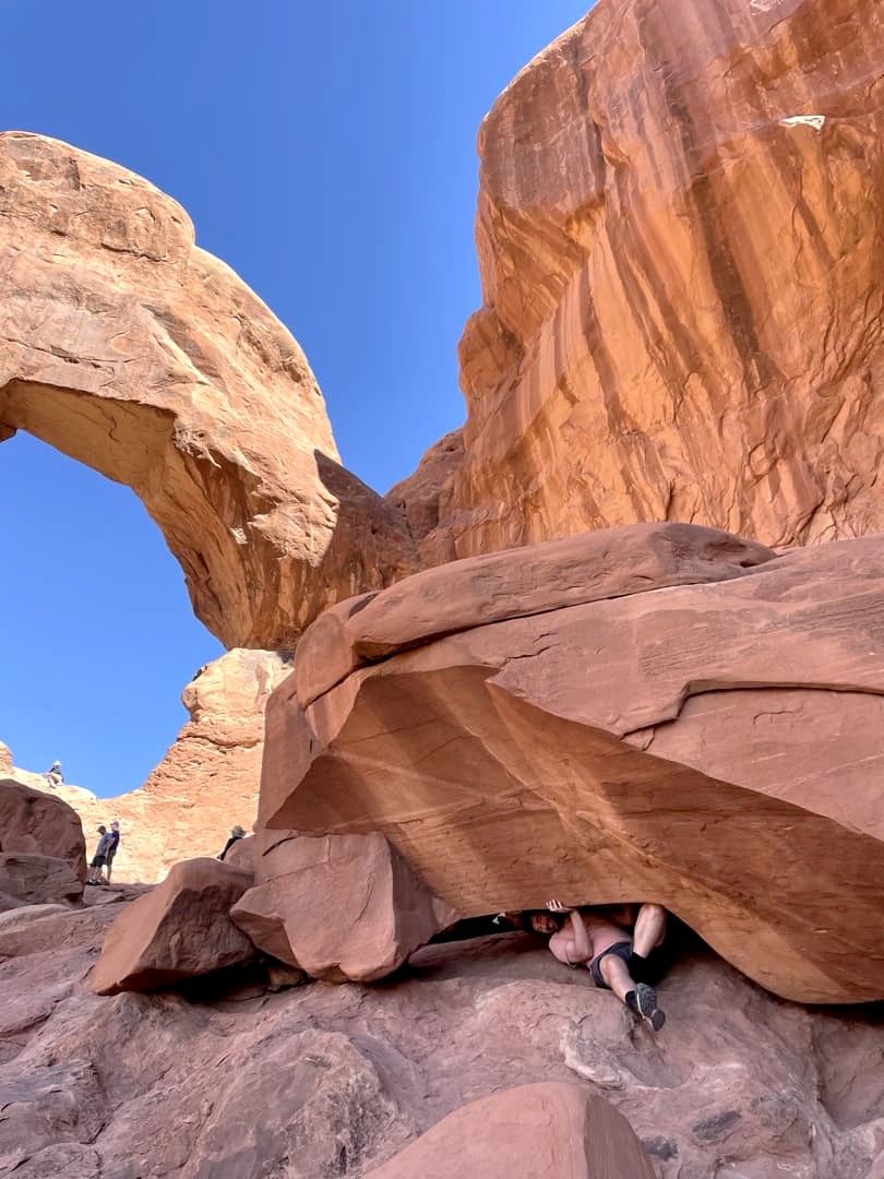 De retour à notre point de départ, nous sommes ensuite parti de l’autre côté du parking, en direction de la Double Arch. Une petite marche facile mène à cette arche connue pour être notamment apparue dans Indiana Jones. Une fois arrivés au pied de cette double arche, il faut ensuite crapahuter un peu si vous voulez prendre un peu de hauteur.