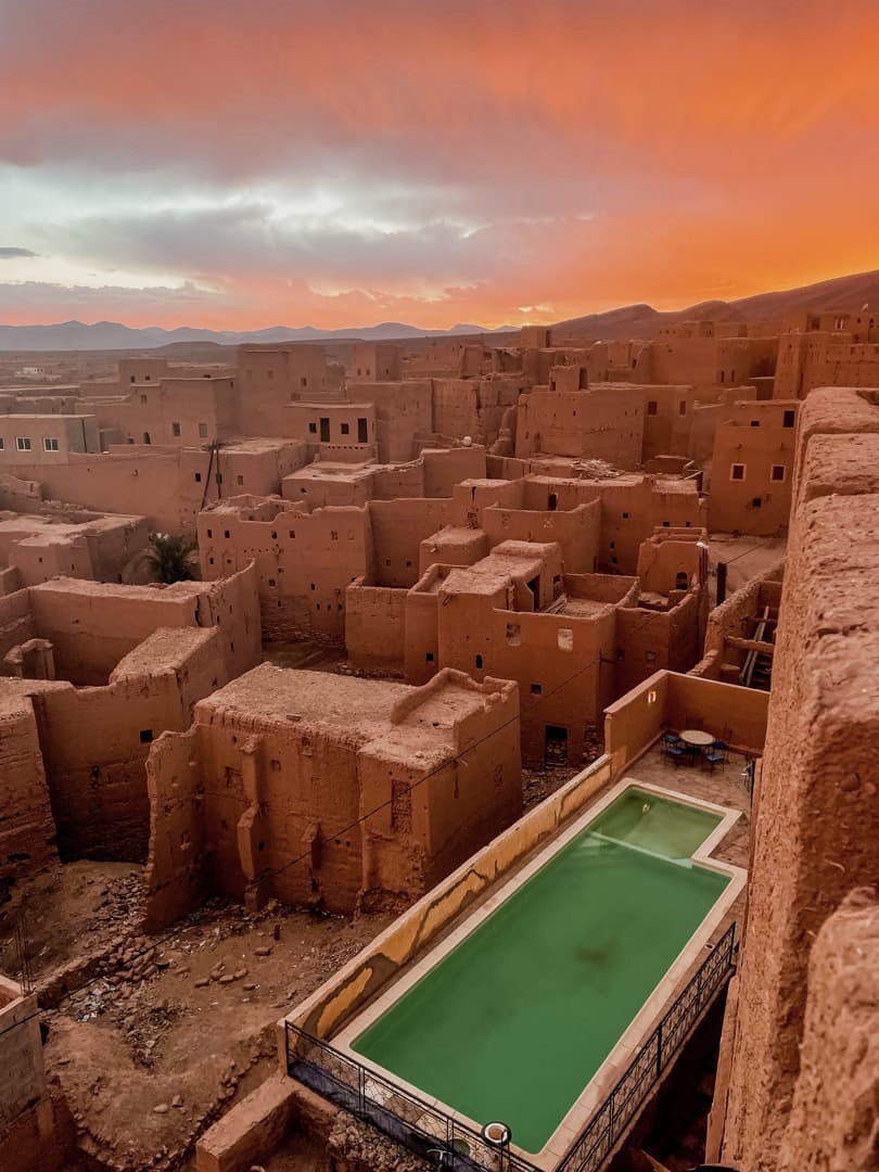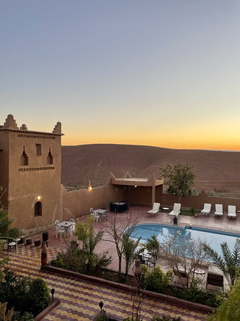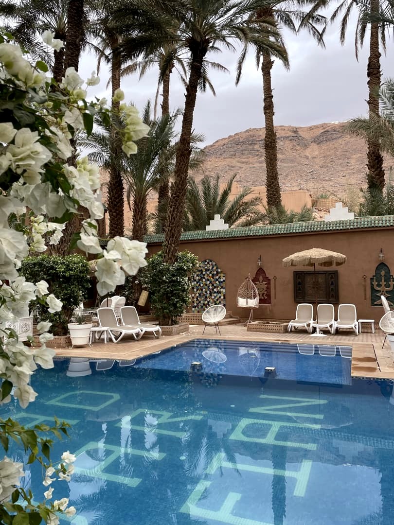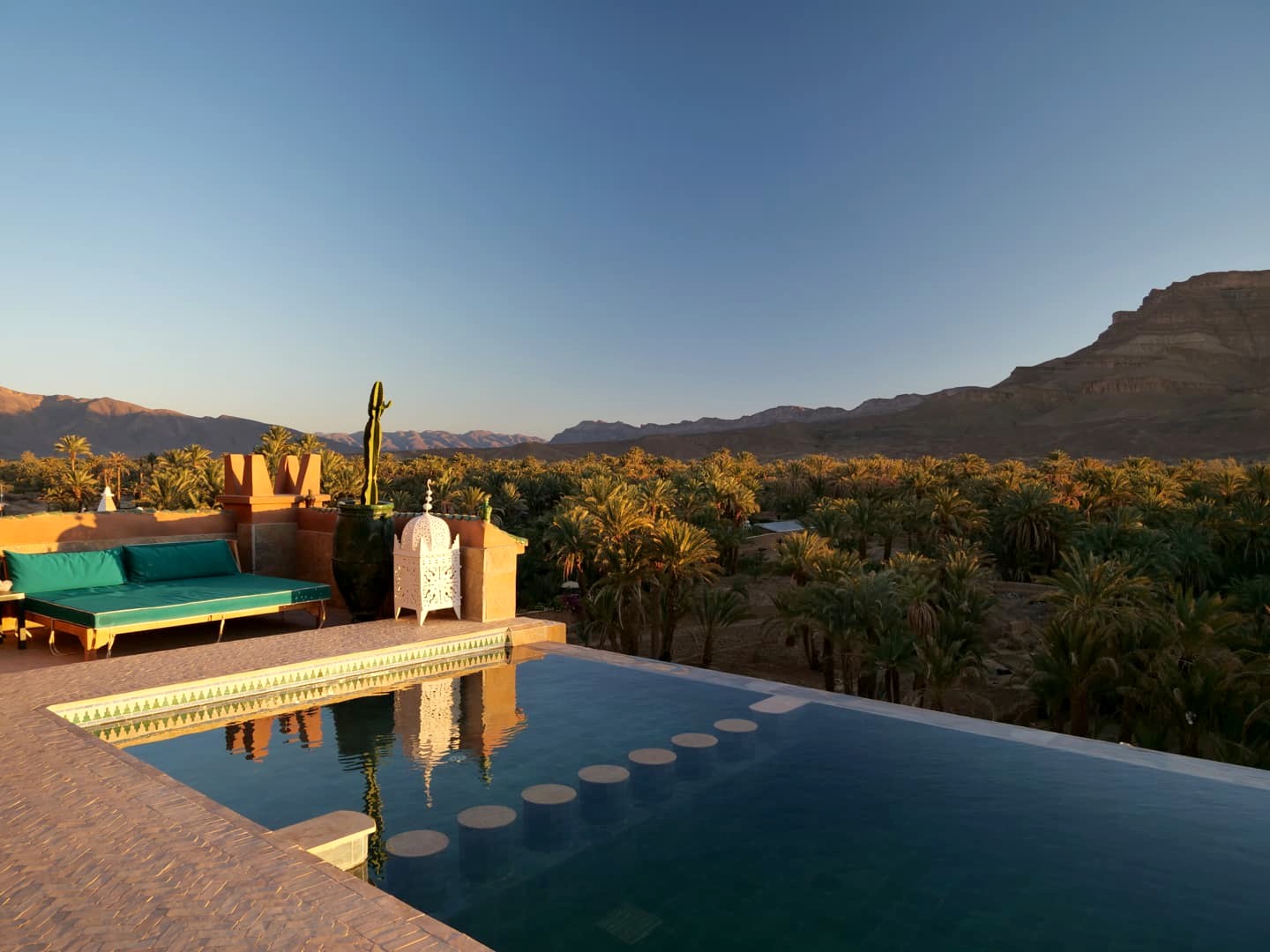 Nous avons passé la première nuit à la Kasbah Oulad Othmane, LE meilleur rapport qualité prix du voyage : une kasbah restaurée avec goût, avec une vue sur la palmeraie et sur le village… vraiment incroyable, surtout au coucher du soleil (et une piscine plutôt scénique aussi !). Voir plus de photos et les tarifs actuels ici.